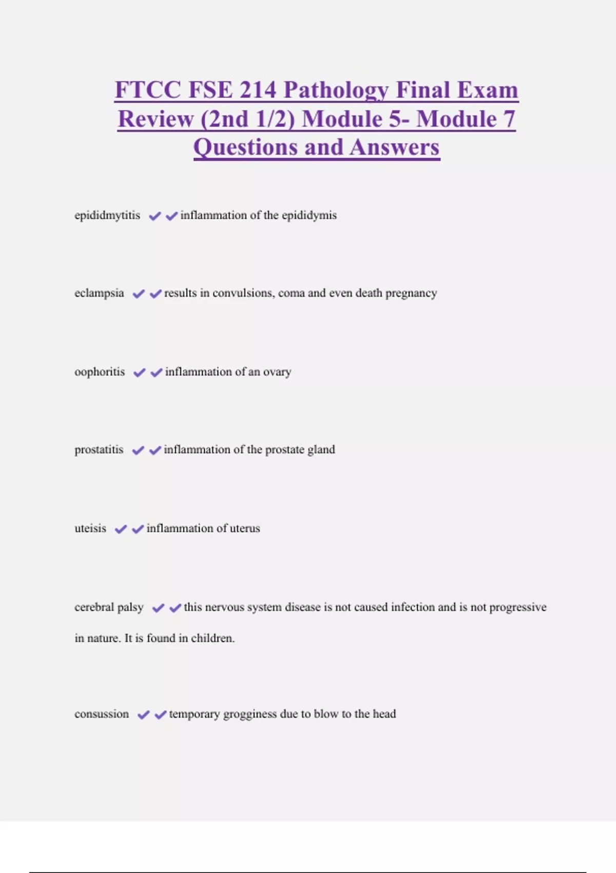 FSE 214.0902 Mid-Term Exam Questions and Answers 100% Solved 2 Exam (elaborations) FSE 214 Pathology Midterm Prep Questions with Correct Answers 3 Exam (elaborations) FSE 214 Module 7 Quiz and Answers 100% Solved 4 Exam (elaborations) FSE 214 Final Study Terms Questions and Answers 100% Solved 5 Exam (elaborations) Pathology FSE-214-0904 Final