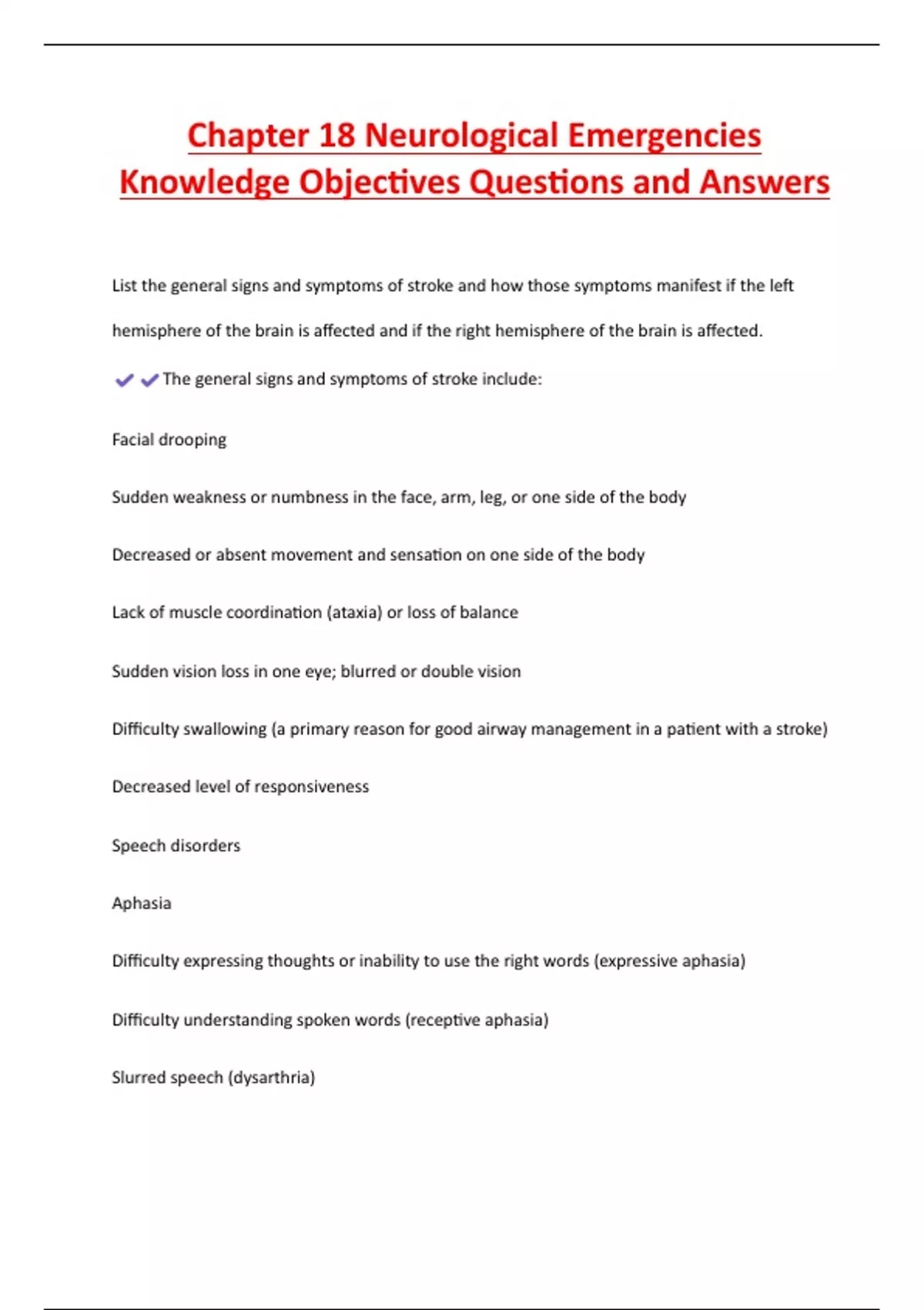 Exam (elaborations) Chapter 18 Neurological Emergencies Knowledge Objectives Questions and Answers 2 Exam (elaborations) Emergency Nursing Orientation 3.0 Neurological Emergencies Questions with Complete Solutions 3 Exam (elaborations) CEN Neurological Emergencies Questions with Complete Solutions 4 Exam (elaborations) Chapter 18 Neurological E