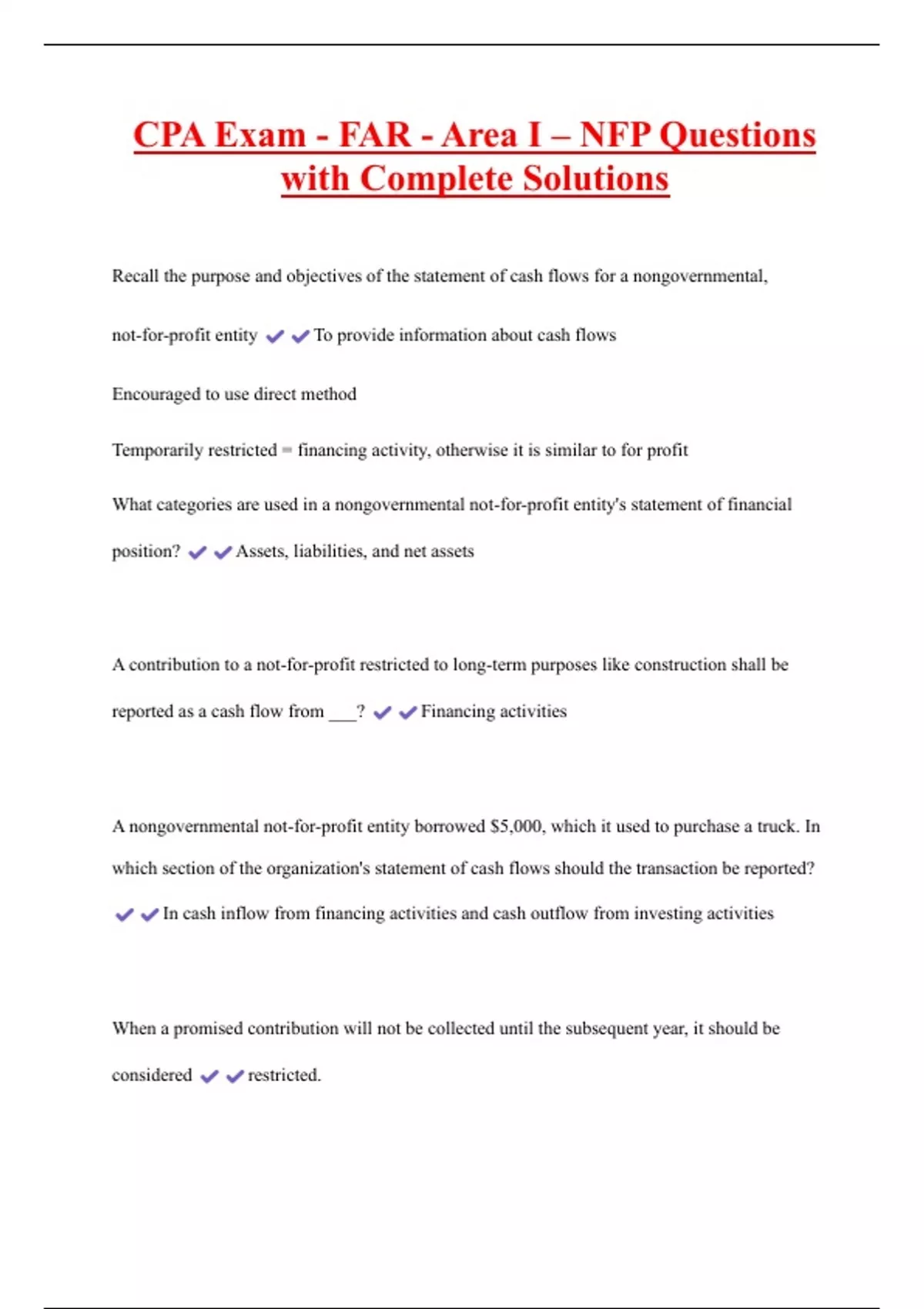 NFP Test Questions and Answers 100% Correct 2 Exam (elaborations) NFP Exam 3 (CH6, 7, & 8) Questions with Complete Solutions 3 Exam (elaborations) NFP Final Exam Review Chapter 14 Questions and Answers Graded A+ 4 Exam (elaborations) NFP HW MC Exam 1 Questions and Answers|Latest Update 5 Exam (elaborations) F6: NFP Revenue Recognition Questions