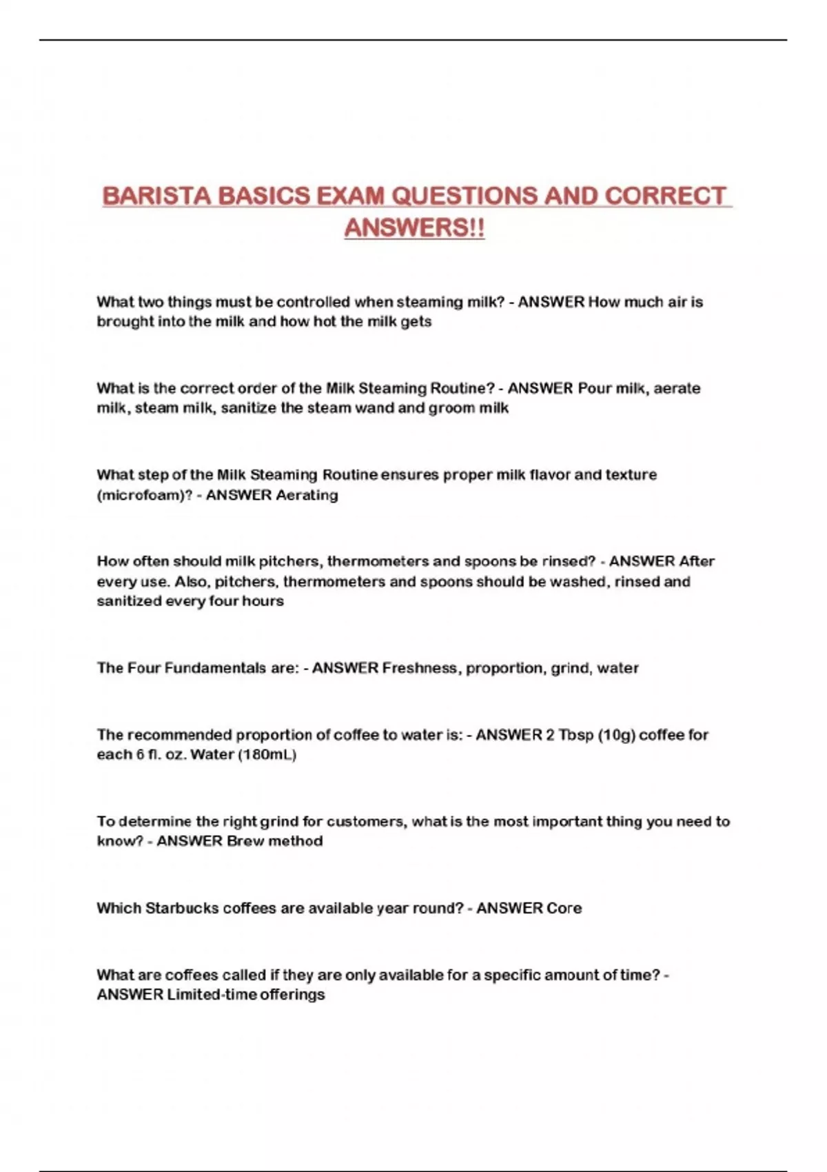 BARISTA BASICS EXAM QUESTIONS AND CORRECT ANSWERS!!