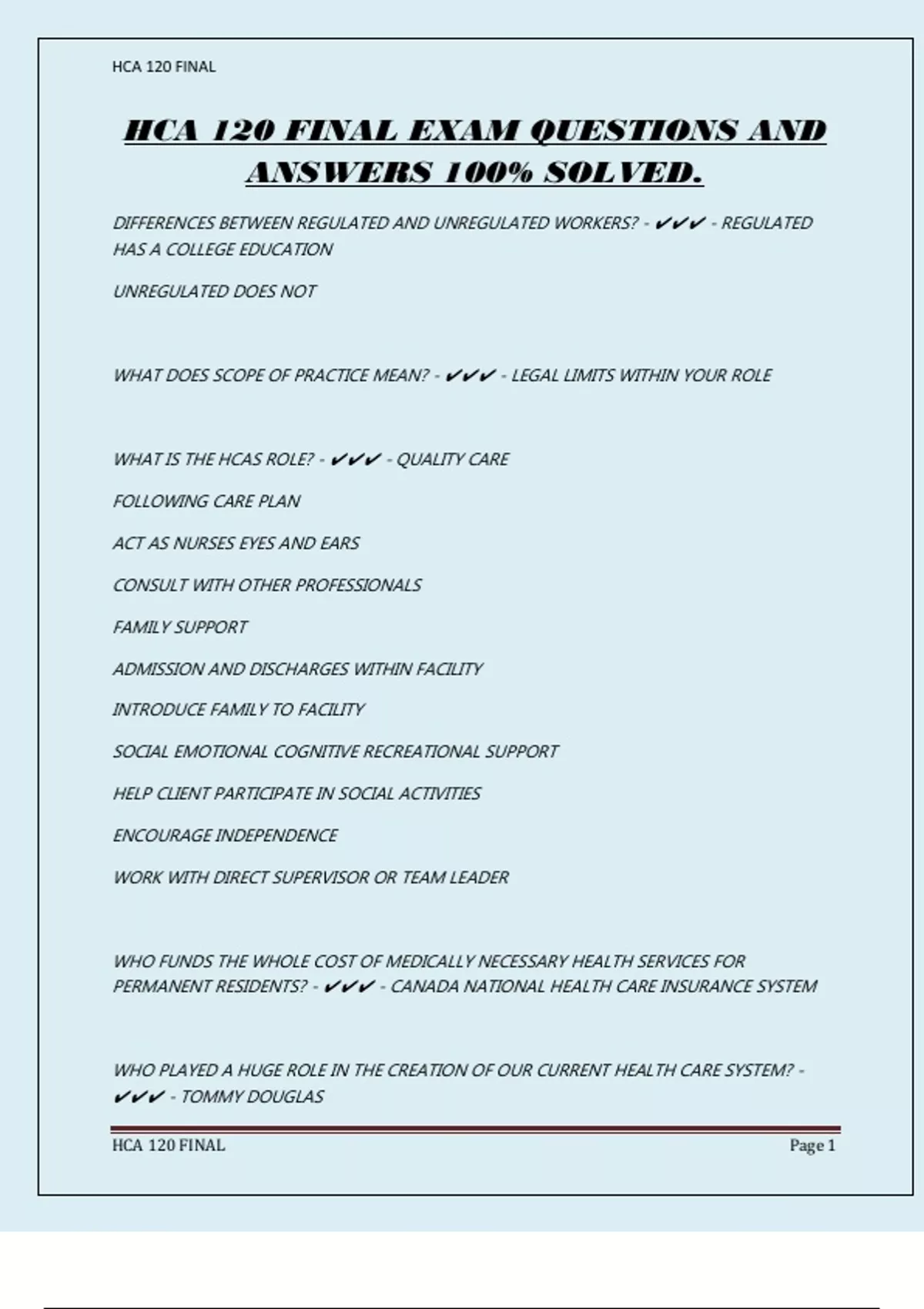 HCA 120 FINAL EXAM QUESTIONS AND ANSWERS 100% SOLVED.