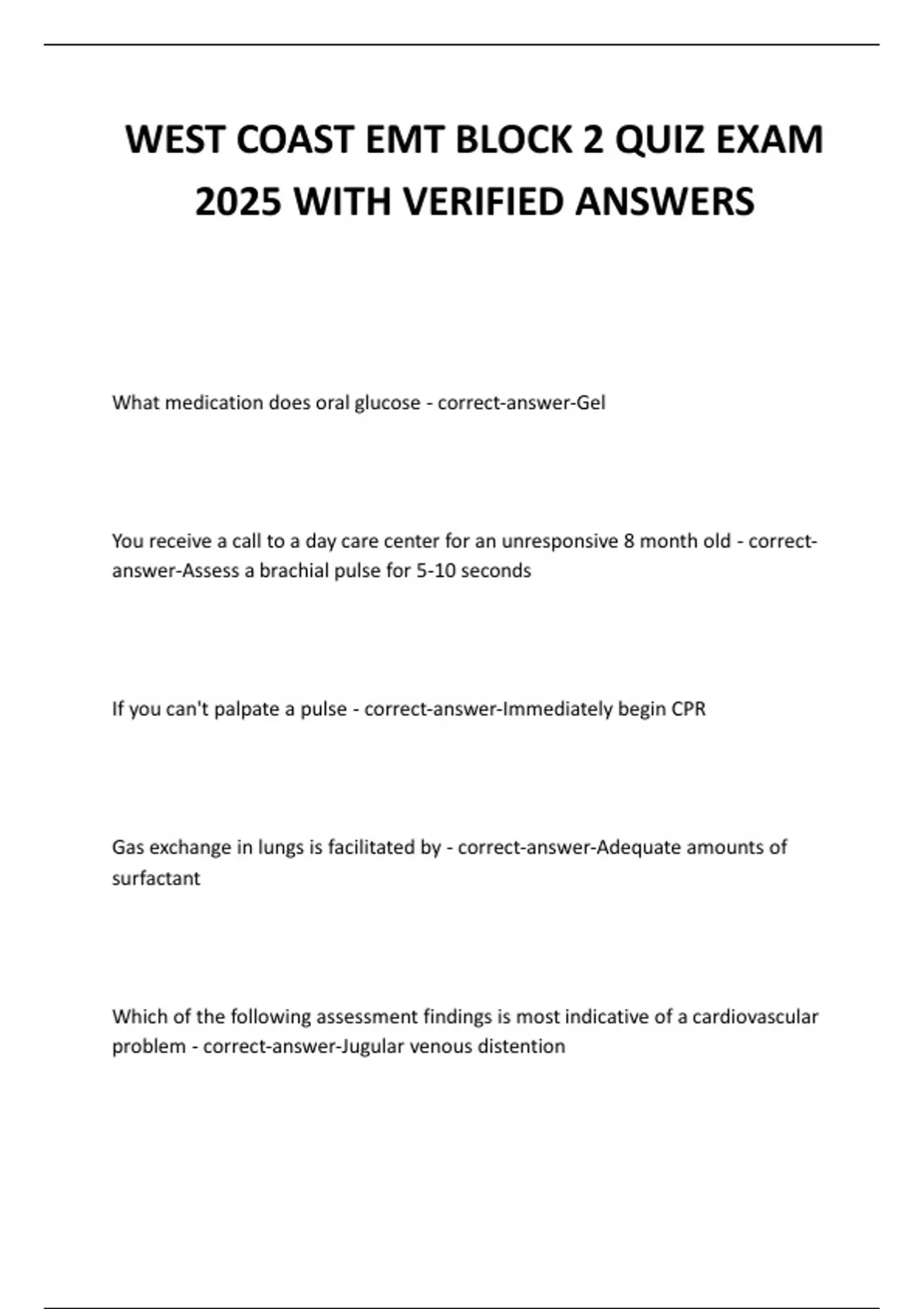 This package contains 6 exams(elaborations)WEST COAST EMT BLOCK 2,3 ,4 EXAMS 2025 WITH 100% VERIFIED QUESTIONS AND CORRECT ANSWERS|EXCELLENT SCORES