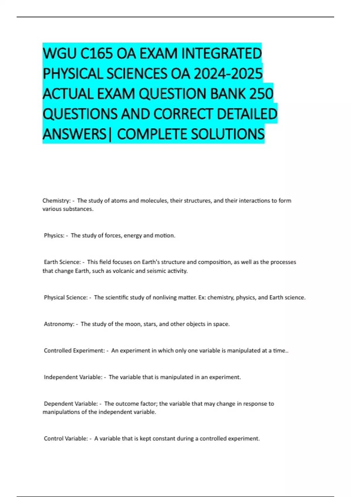 WGU C165 INTEGRATED PHYSICAL SCIENCES VERIFIED QUESTIONS AND ANSWERS Physics - The study of forces, energy, motion Chemistry - The study of atoms and molecules, their structures, and their interactions to form substances Earth science - The study