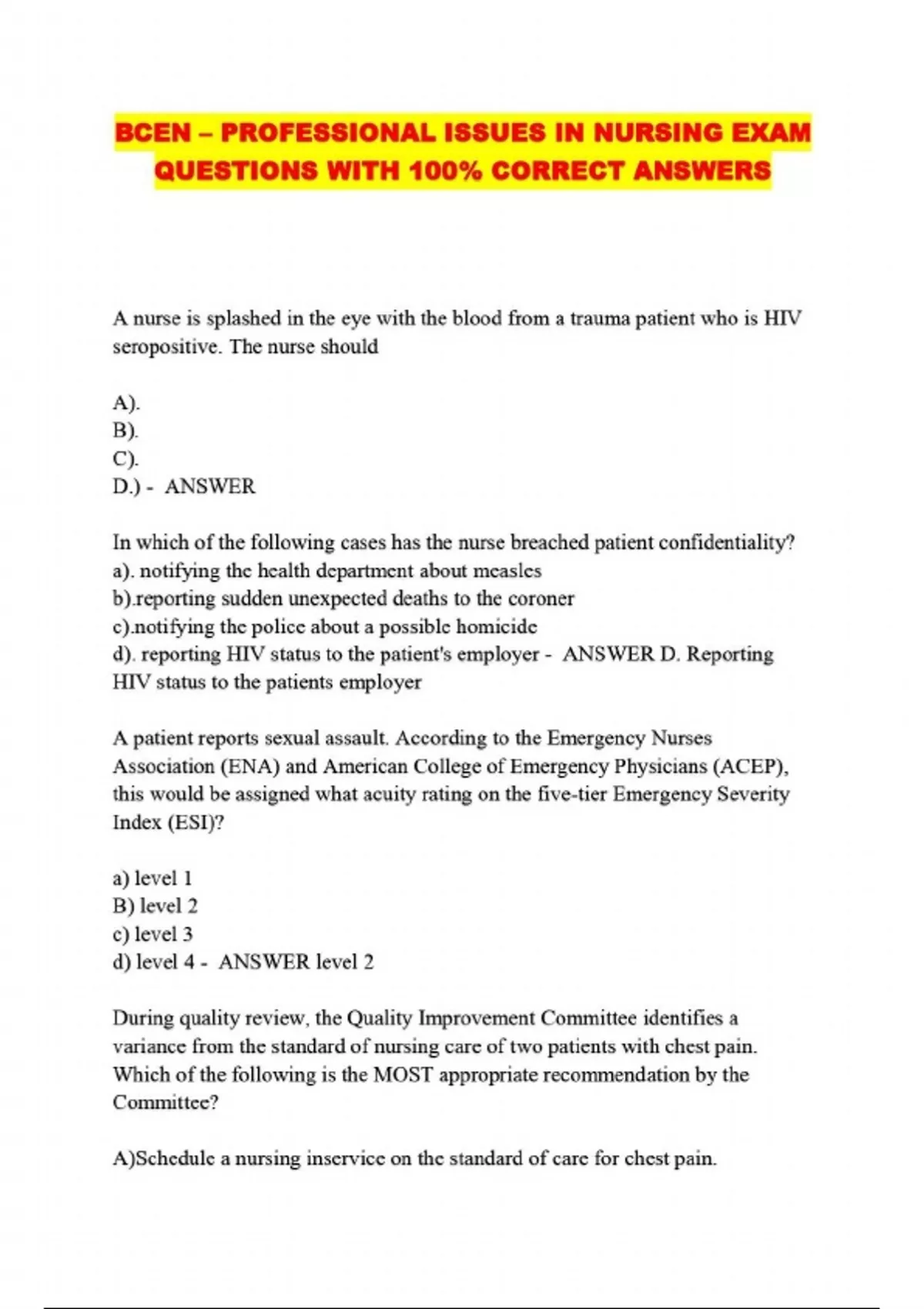 BCEN – PROFESSIONAL ISSUES IN NURSING EXAM QUESTIONS WITH 100% CORRECT ANSWERS