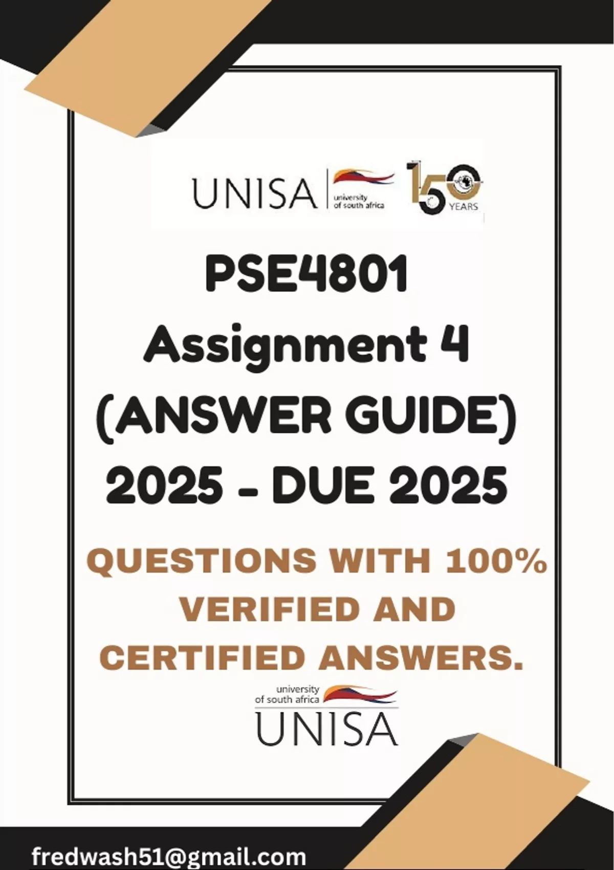 PSE4801 ASSIGNMENTs 1,2,3 & 4 2025 QUESTIONS WITH 100% VERIFIED AND CERTIFIED ANSWERS. WRITTEN IN REQUIRED FORMAT AND WITHIN GIVEN GUIDELINES. IT IS GOOD TO USE AS A GUIDE AND FOR REFERENCE, NEVER PLAGARIZE. Thank you and success in your academics. PREPARED BY DR. FRED UNISA, 2025.