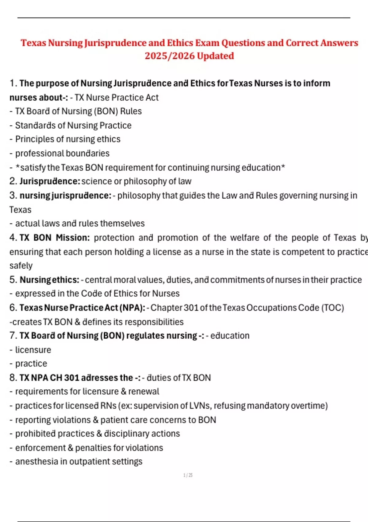 Texas Nursing Jurisprudence Test – Exam Questions with Revised Answers – Latest 2025/2026 Edition Jurisprudence Texas Nursing Exam – Test Questions and 100% Verified Answers – New Update 2025/2026 Nursing Jurisprudence and Ethics for Texas Nurses – Latest 2025/2026 Exam Questions and Revised Answers Texas BON Study Guide, BON Quiz, and Nursing Juri