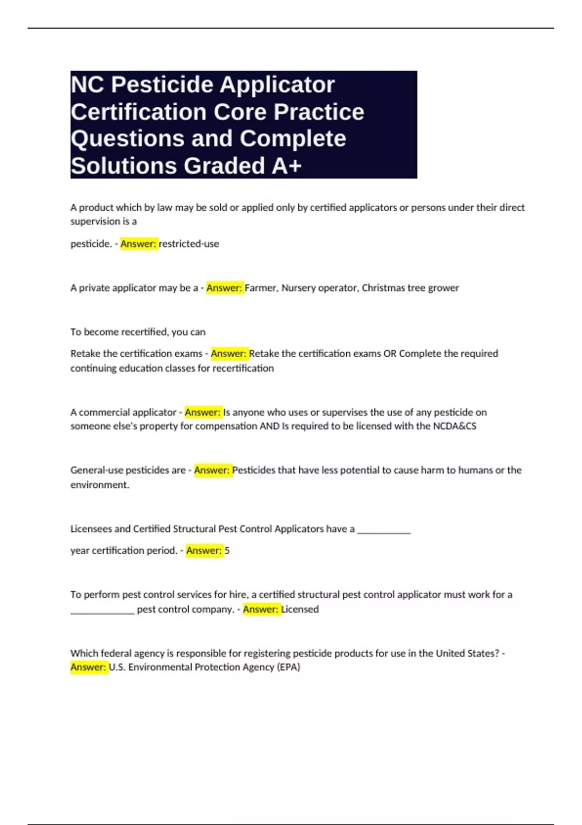 North Carolina Pesticide Applicator Certification Questions and Complete Solutions Graded A Package Deal