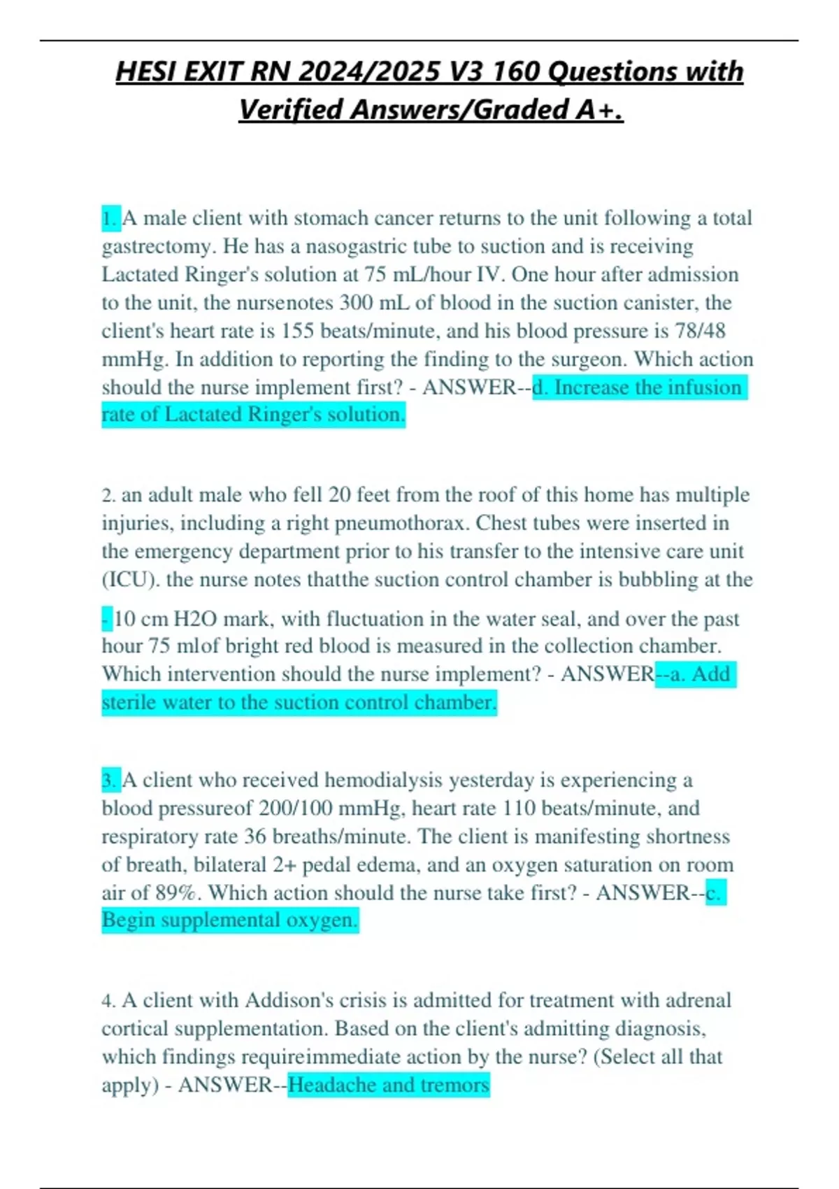 PN HESI EXIT V4 EXAM QUESTION AND CORRECT ANSWERS 100% CORRECT SOLUTION