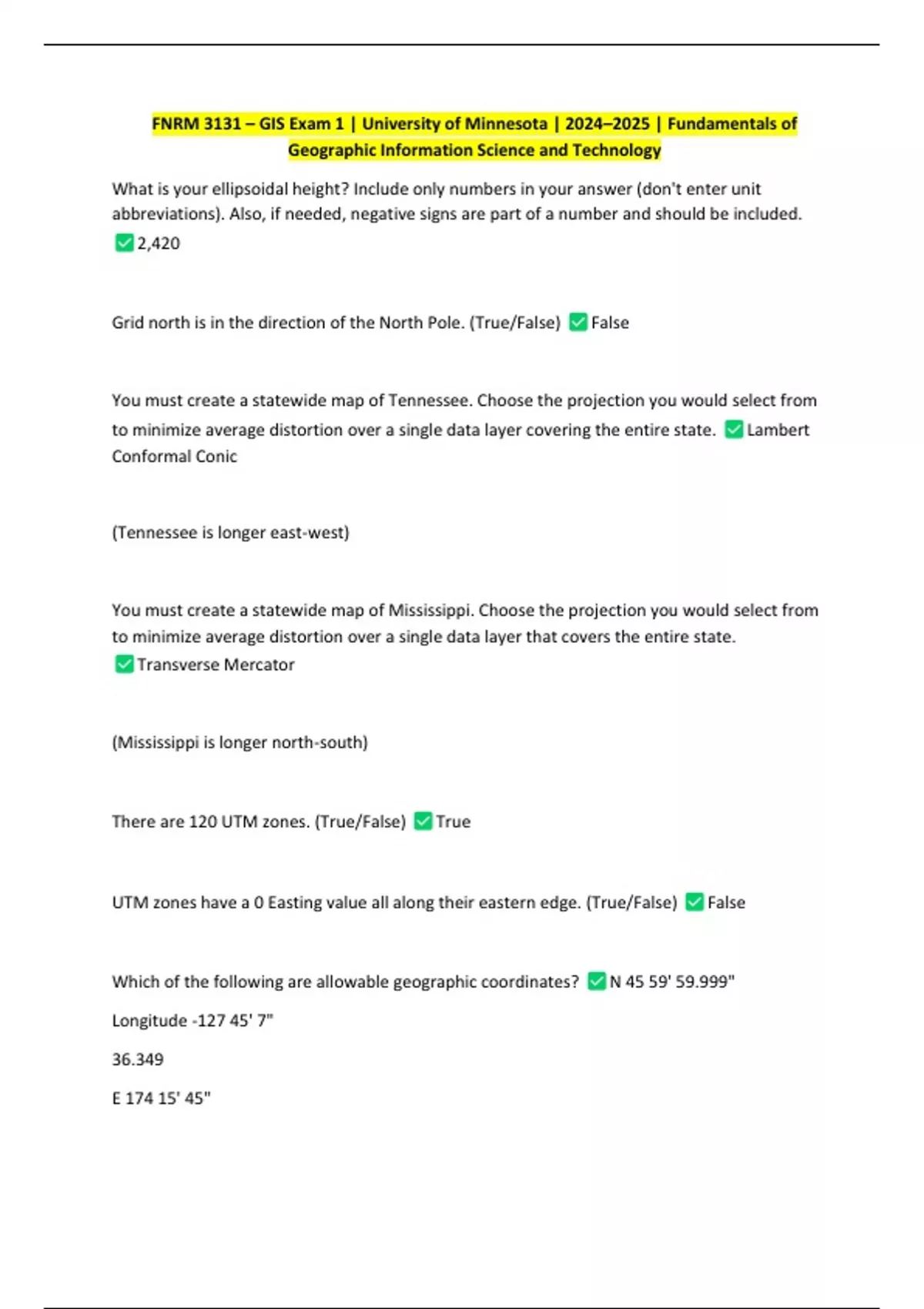 FNRM 3131 – GIS Final Exam | University of Minnesota | 2024–2025 | Comprehensive Review with Questions and Answers 3 Exam (elaborations) FNRM 3131 – Geographic Information Science (GIS) | University of Minnesota | Final Exam Study Guide with Key Concepts 4 Exam (elaborations) FNRM 3131 – GIS Exam 3 | University of Minnesota | 2024–2025 | Geographic