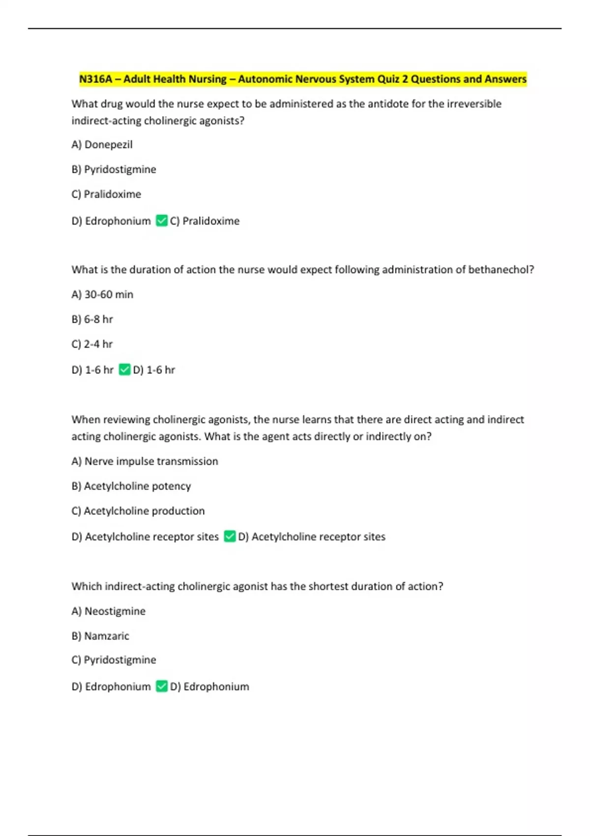 N316A – Adult Health Nursing – Autonomic Nervous System Quiz 2 Questions and Answers 2 Exam (elaborations) N316A – Adult Health Nursing – Exam 1 Questions and Answers 3 Exam (elaborations) N316A – Adult Health Nursing – Infections Quiz 4 Questions and Answers 4 Exam (elaborations) N316A – Adult Health Nursing – Exam 3 Review Questions and Answers 5