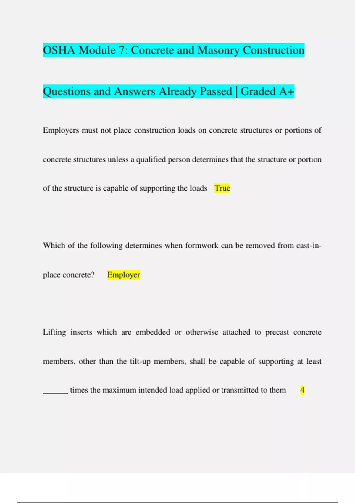 OSHA Module 7: Concrete and Masonry Construction Questions and Answers Already Passed | Graded A+