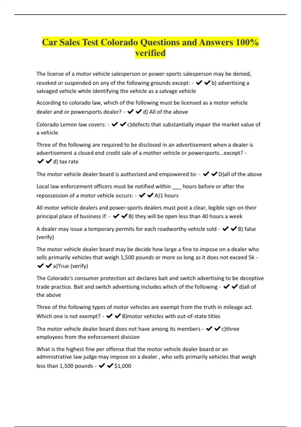 BUNDLE FOR CAR-AUTO SALES LICENSE EXAMS QUESTIONS AND 100% CORRECT ANSWERS 2025/2026