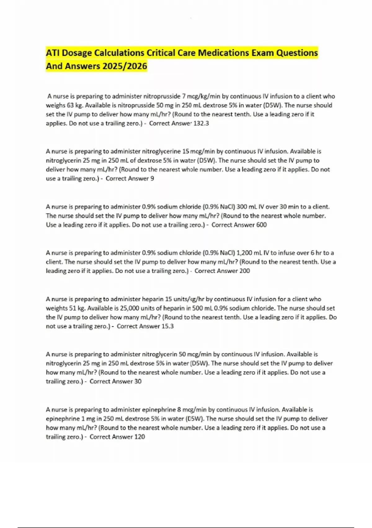 ATI Dosage Calculation and Safe Medication Administration 3.0 - Critical Care Medications Exam Questions And Answers 2025/2026/ATI Critical Care Dosage Calculations Exam Questions with 100% Correct Answers/Dosage Calculation RN Critical Care Online Practice Assessment 3.0 Exam Questions And Answers