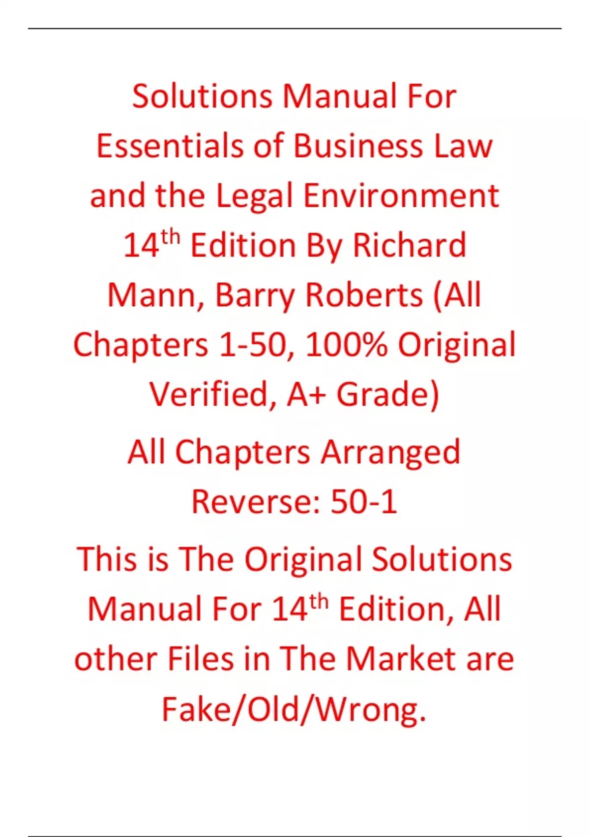 Solutions Manual with Test Bank for Essentials of Business Law and the Legal Environment 14th Edition By Richard Mann, Barry Roberts Solutions Manual with Test Bank for Essentials of Business Law and the Legal Environment 14th Edition By Richard Mann, Barry Roberts
