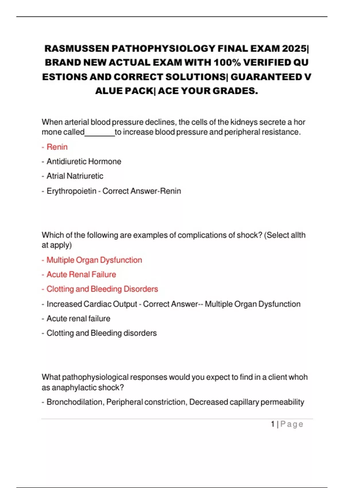PATHOPHYSIOLOGY Final EXAM Questions and Answers Latest (2024 / 2025) (Verified Answers)