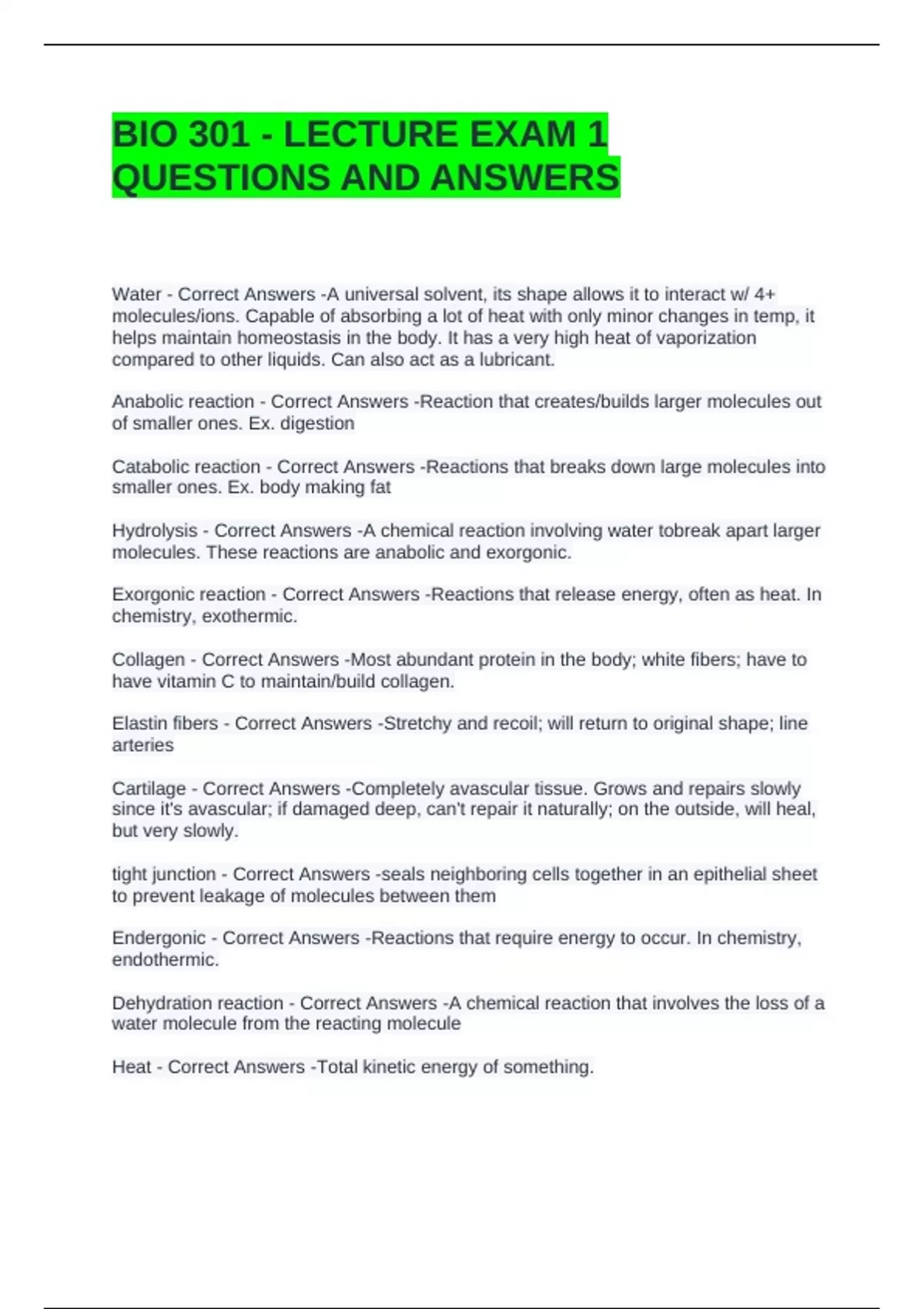 BIO 301 - LECTURE EXAM 1 QUESTIONS AND ANSWERS