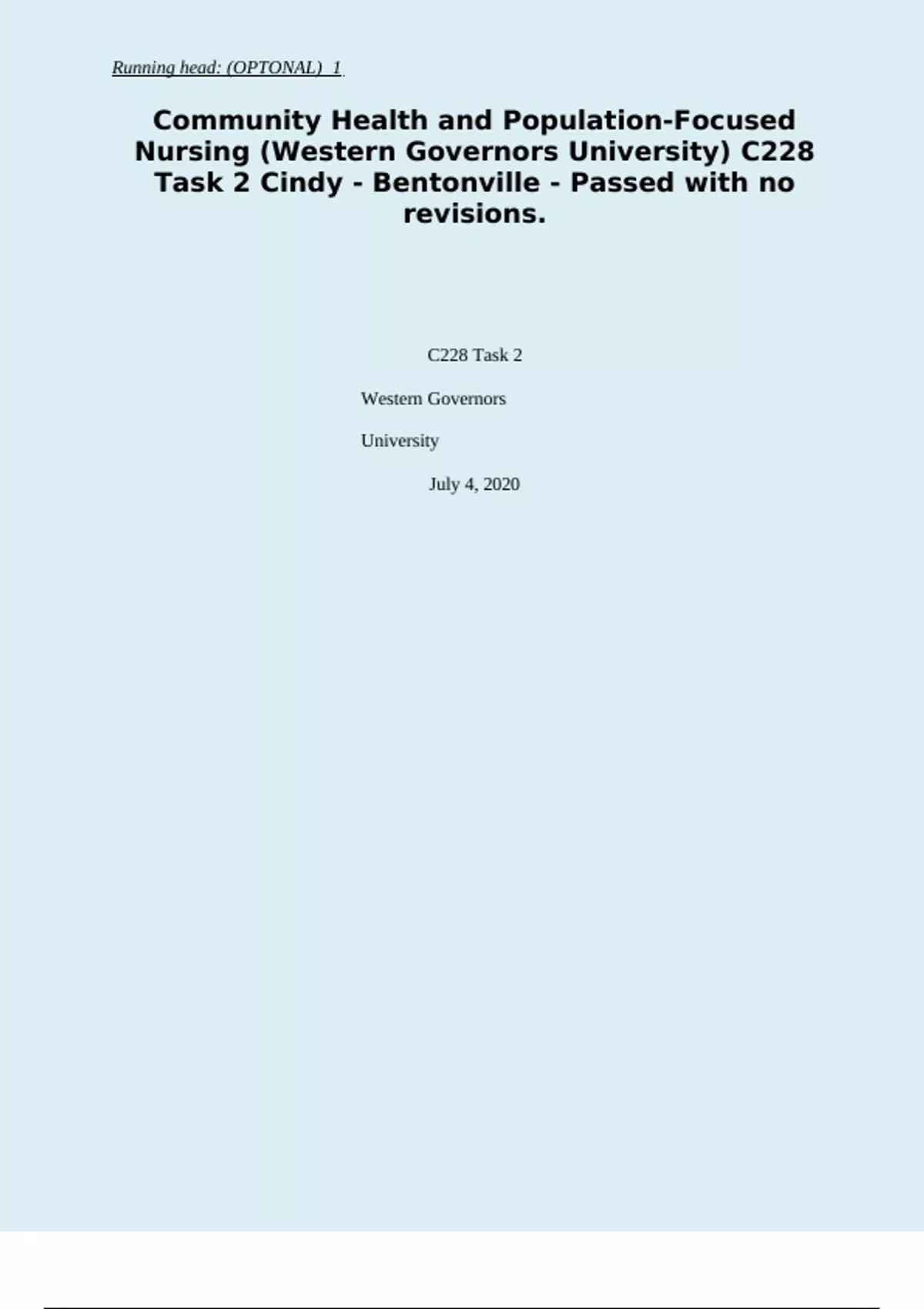 Community Health and Population-Focused Nursing (Western Governors University) C228 Task 2 Cindy - Bentonville - Passed with no revisions.