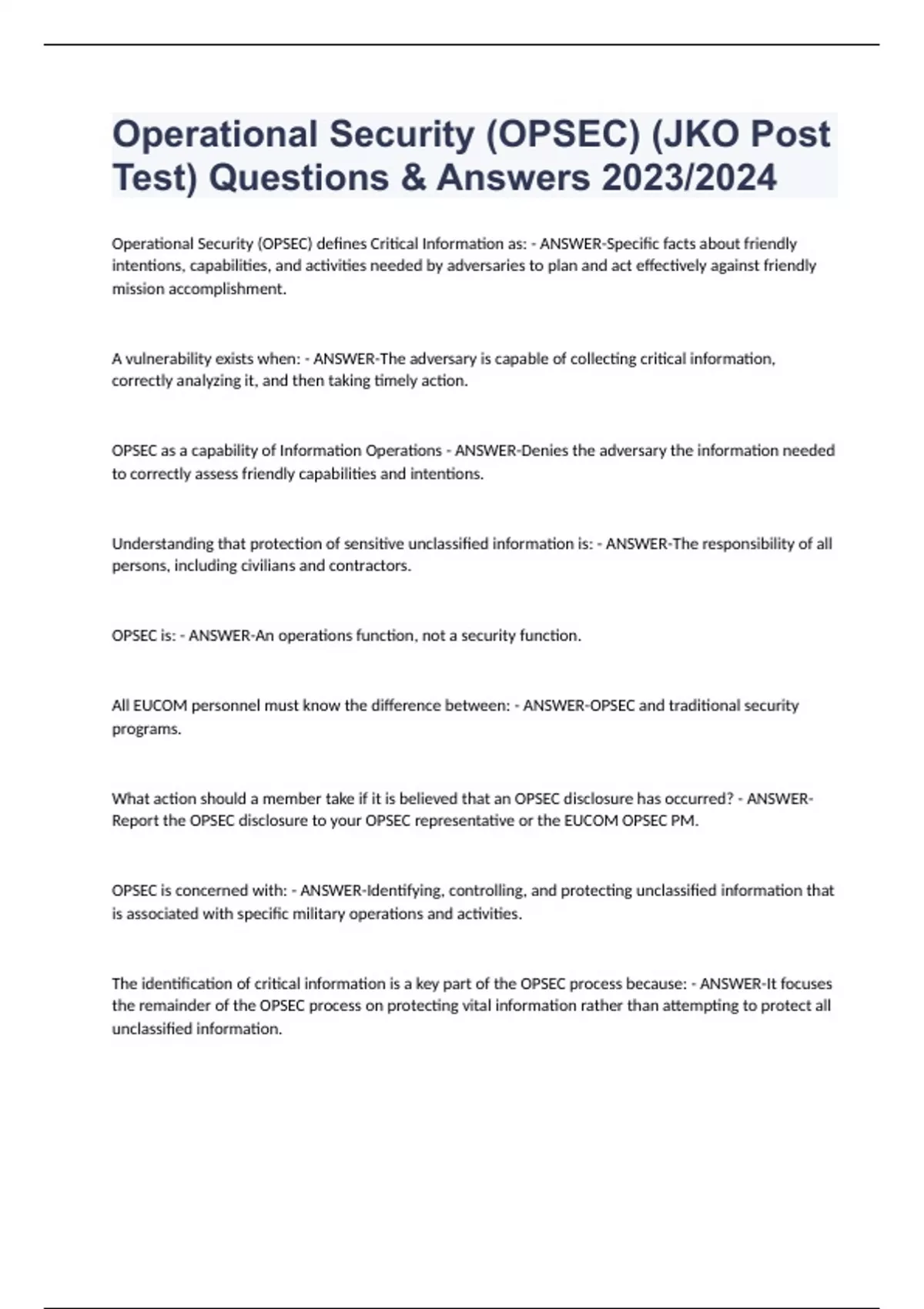 Operational Security (OPSEC) (JKO Post Test) Questions & Answers 2023/2024
