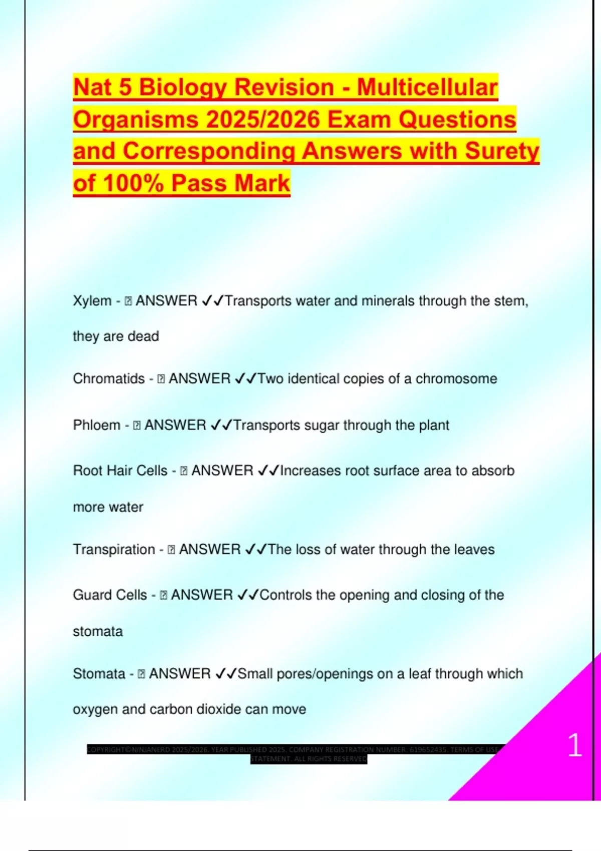 Nat 5 Biology Revision - Multicellular Organisms 2025/2026 Exam Questions and Corresponding Answers with Surety of 100% Pass Mark