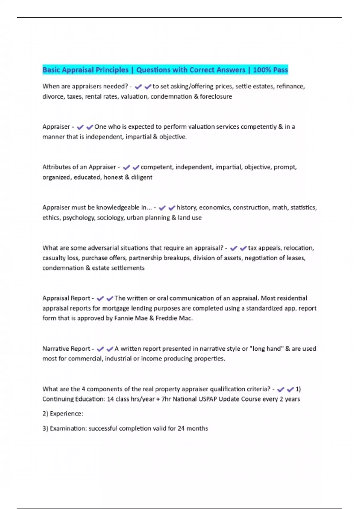 BUNDLE PACKAGE:::::Basic Appraisal PrinciplesExams | Questions with Correct Answers | 100% Pass