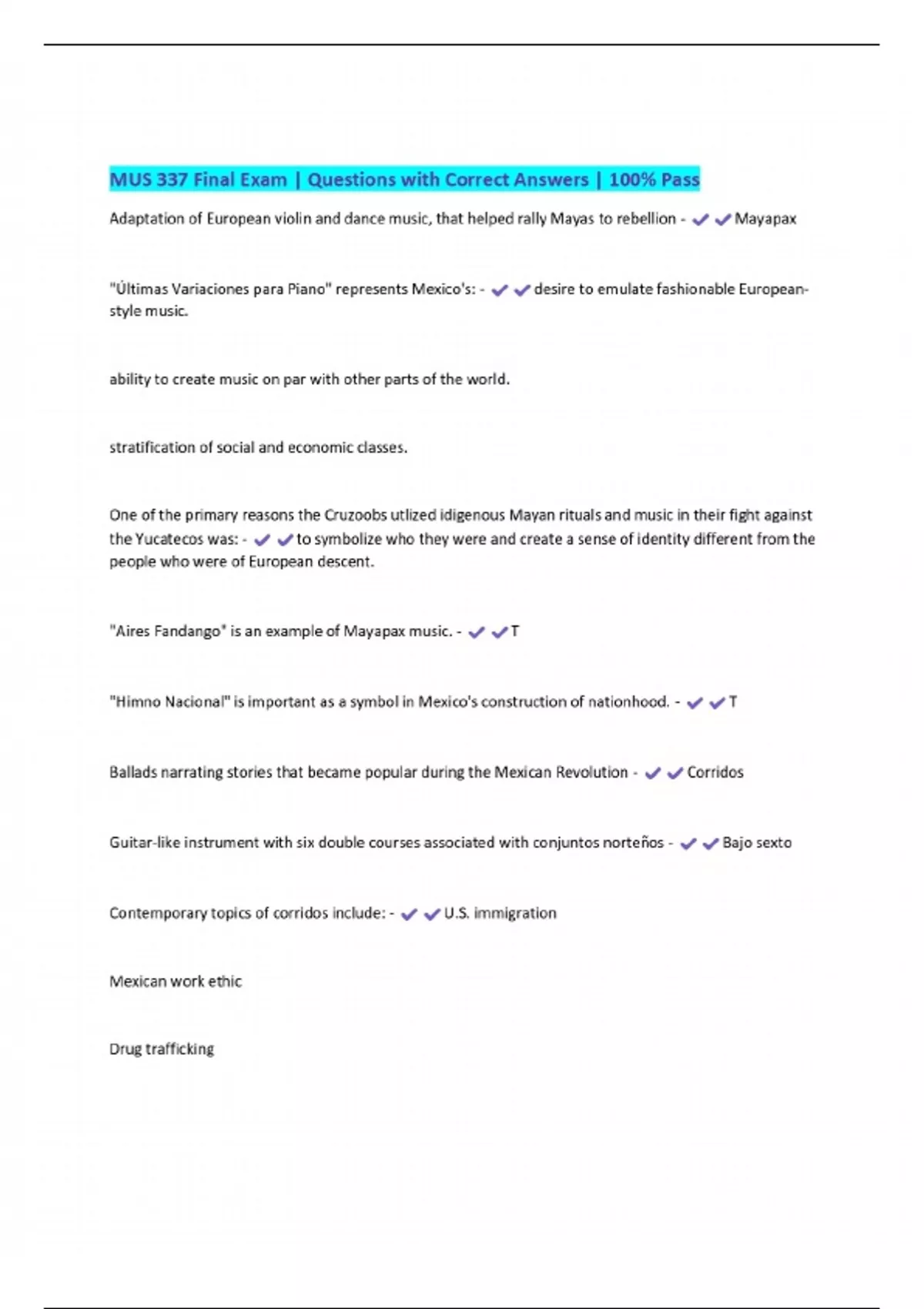 BUNDLE PACKAGE:::::MUS 337 | EXAMS | Questions with Correct Answers | 100% Pass