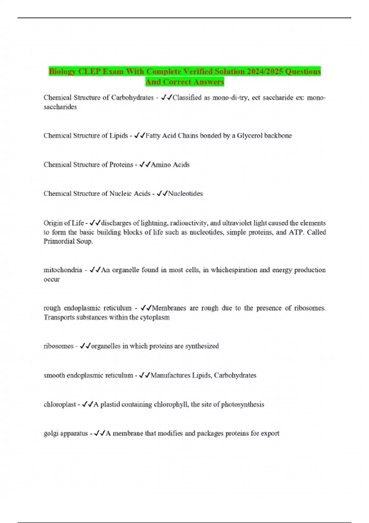 Clep Biology Exam With Complete Verified Solution 2024/2025 Questions And Correct Answers