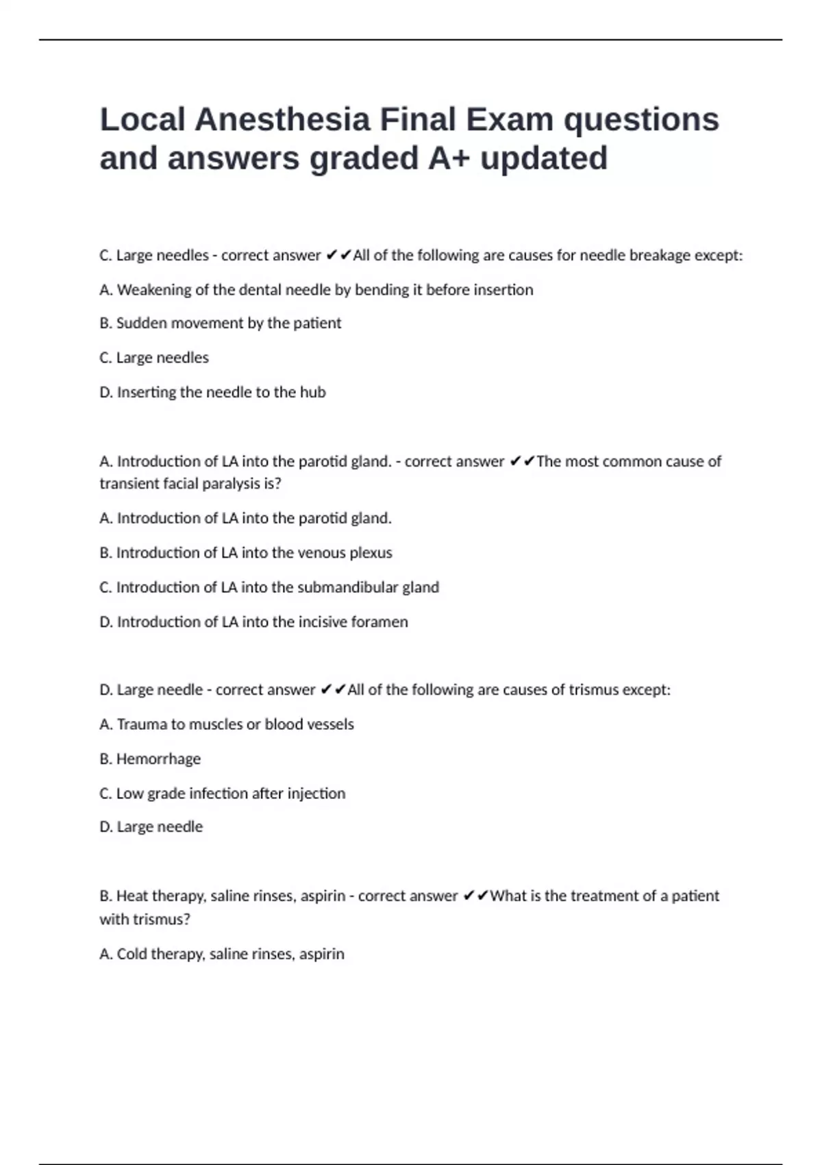 1 Exam (elaborations) CDCA Local Anesthesia Exam questions with verified answers A+ rated 2 Exam (elaborations) Dental Hygiene Local Anesthesia Board Review questions well answered graded A+ 3 Exam (elaborations) Local Anesthesia -CDCA Board exam with verified answers to pass 4 Exam (elaborations) Local Anesthesia Board Prep: Student RDH & CDCA