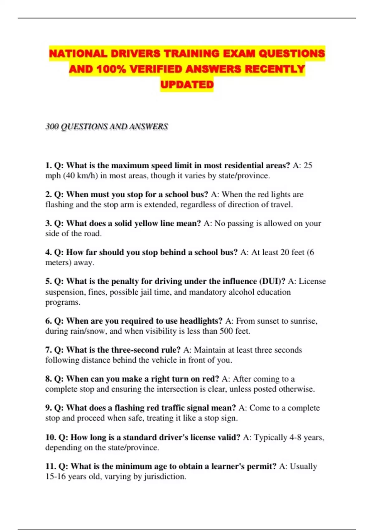 NATIONAL DRIVERS TRAINING EXAM QUESTIONS AND 100% VERIFIED ANSWERS RECENTLY UPDATED