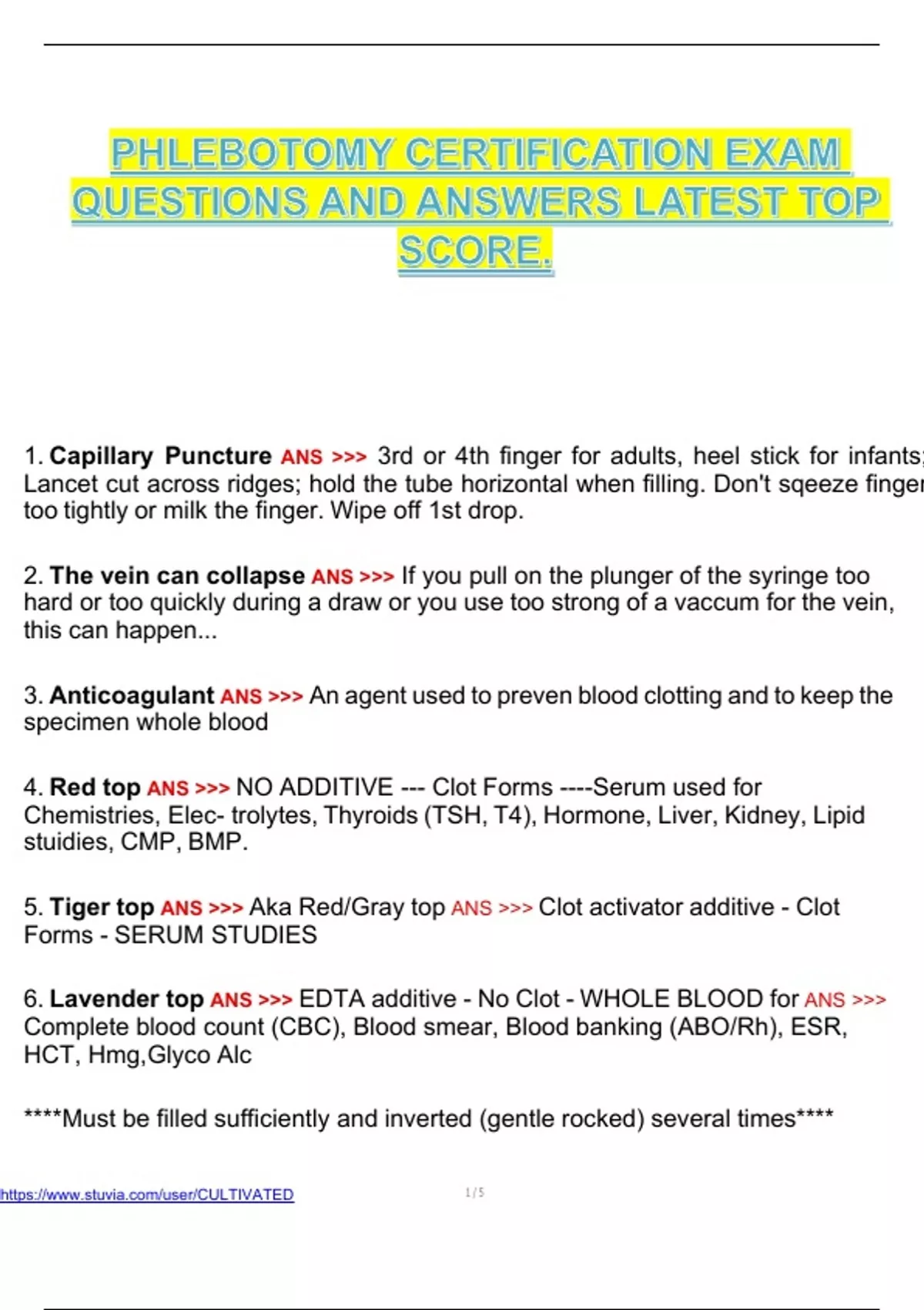 AMCA Phlebotomy Exam questions and answers latest top score NATIONAL PHLEBOTOMY CERTIFICATION EXAM QUESTIONS AND ANSWERS WELL ILLUSTRATED. PHLEBOTOMY EXAM QUESTIONS AND ANSWERS LATEST UPDATE.