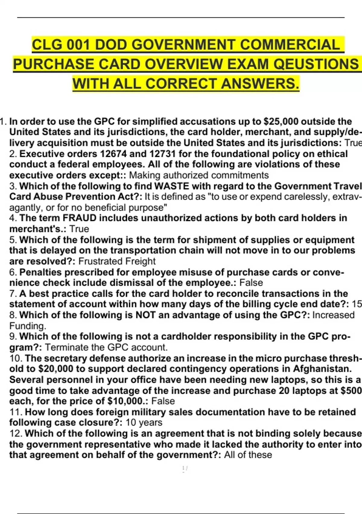 CLG 001 DOD EXAM QUESTIONS AND ANSWERS LATEST TOP SCORE. CLG 0010 ACTUAL TEST WITH CORRECT ANSWERS. CLG 0010 DOD GOVERNMENTWIDE COMMERCIAL PURCHASE CARD OVERVIEW ACTUAL TEST WITH ALL CORRECT ANSWERS.