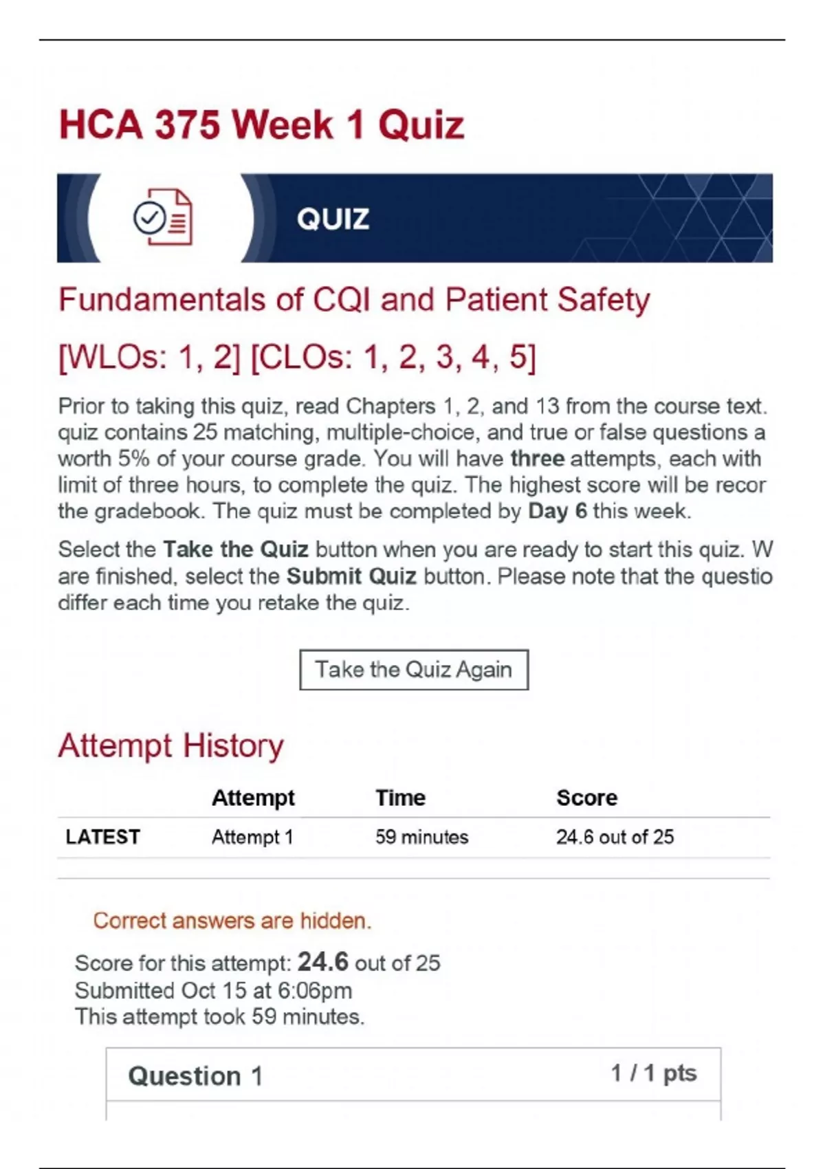 HCA 375 Week 1,2,3,4,5 Quizzes and Final Exam Bundled with complete solutions.