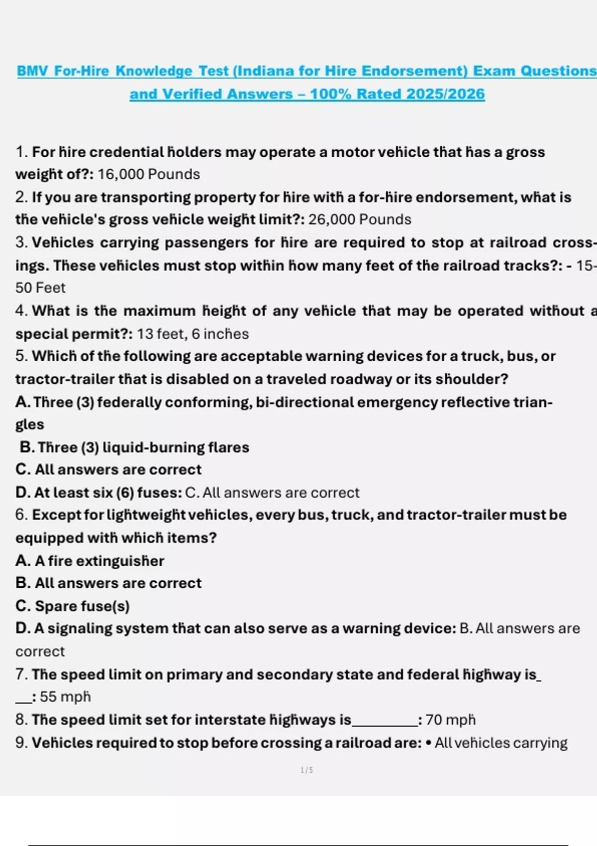 Indiana For-Hire Endorsement 100% Rated Exam with Questions and Revised Answers – Latest Update 2025/2026 Public Passenger License Practice Test – Indiana For-Hire Endorsement Actual Exam Questions and Verified Answers – Updated 2025/2026 Indiana For-Hire Endorsement License Exam, Test Questions and 100% Correct Answers – 2025/2026 Indiana For-Hire