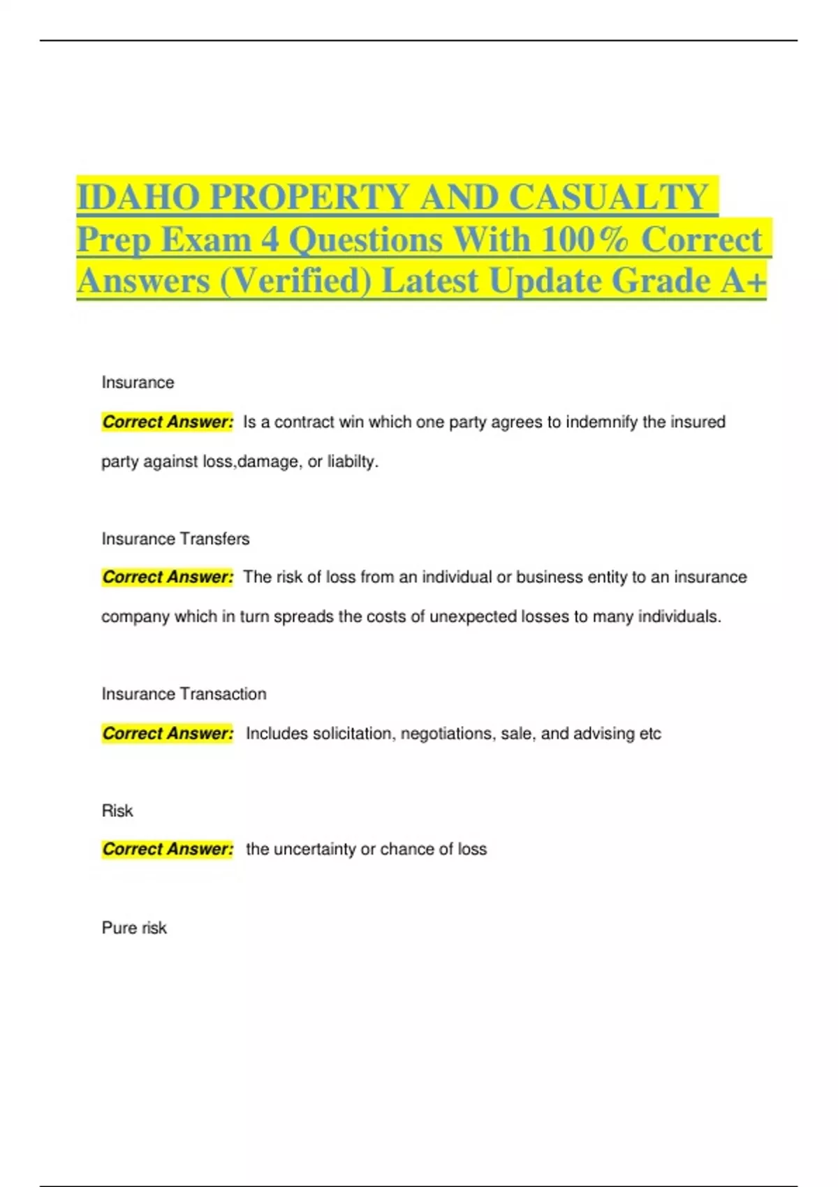 IDAHO PROPERTY AND CASUALTY Prep Exam 4 Questions With 100- Correct Answers (Verified) Latest