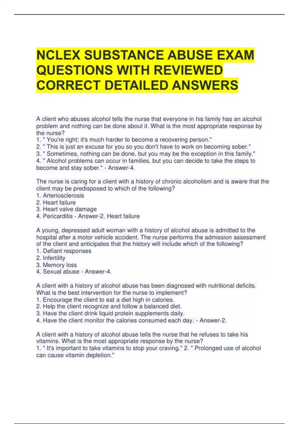 NCLEX SUBSTANCE ABUSE EXAM QUESTIONS WITH REVIEWED CORRECT DETAILED ANSWERS 2 Exam (elaborations) SUBSTANCE ABUSE EXAM QUESTIONS AND ANSWERS ALL CORRECT 3 Exam (elaborations) Substance Abuse Exam Questions with 100% Correct Answers 4 Exam (elaborations) SUBSTANCE ABUSE EXAM QUESTIONS WITH REVIEWED 100% CORRECT DETAILED ANSWERS GUARANTEED PASS 5