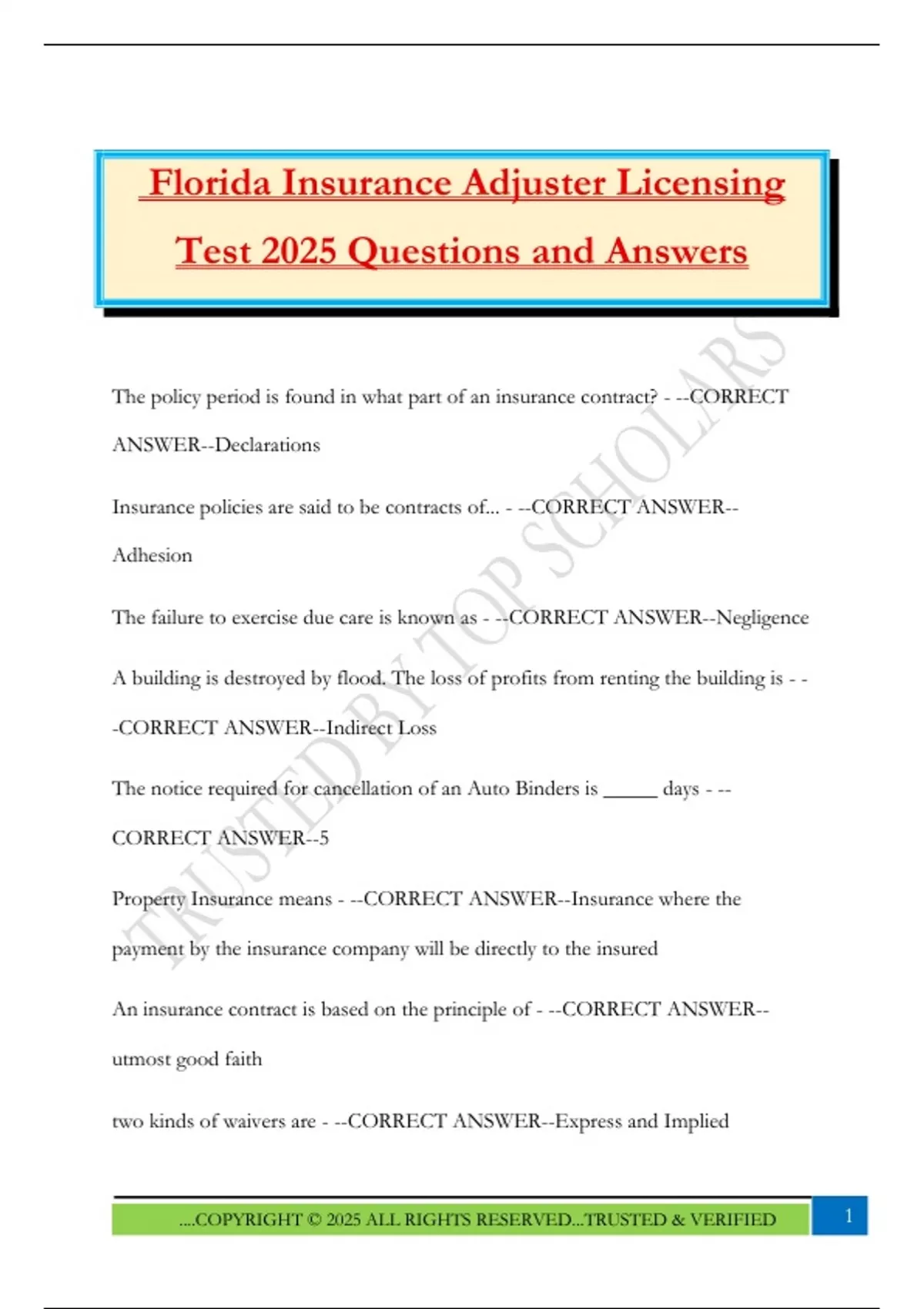Claims Adjuster's Exam (FL) Exam 2025 Questions and Answers
