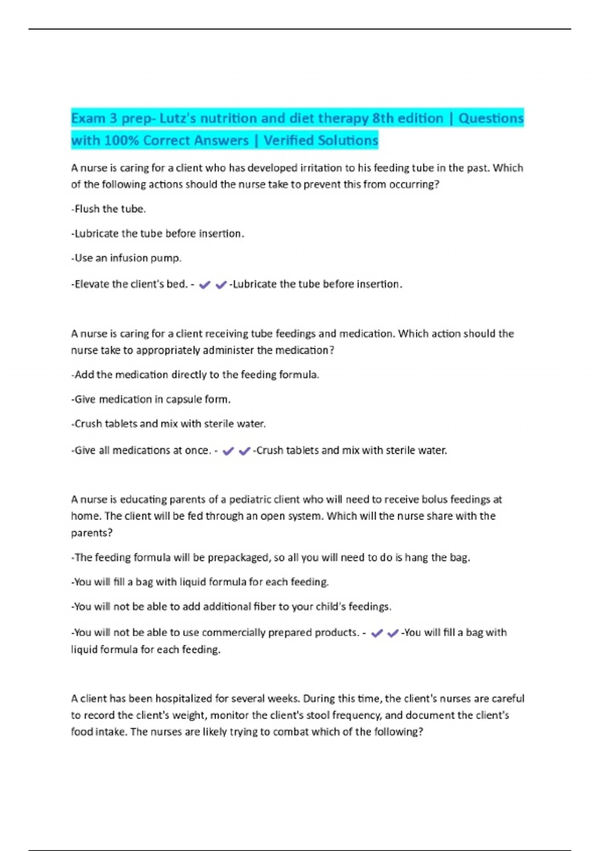 EXAMS BUNDLE PACKAGE FOR:::Lutz Nutrition and Diet Therapy Exam | Questions with 100% Correct Answers | Verified Solutions