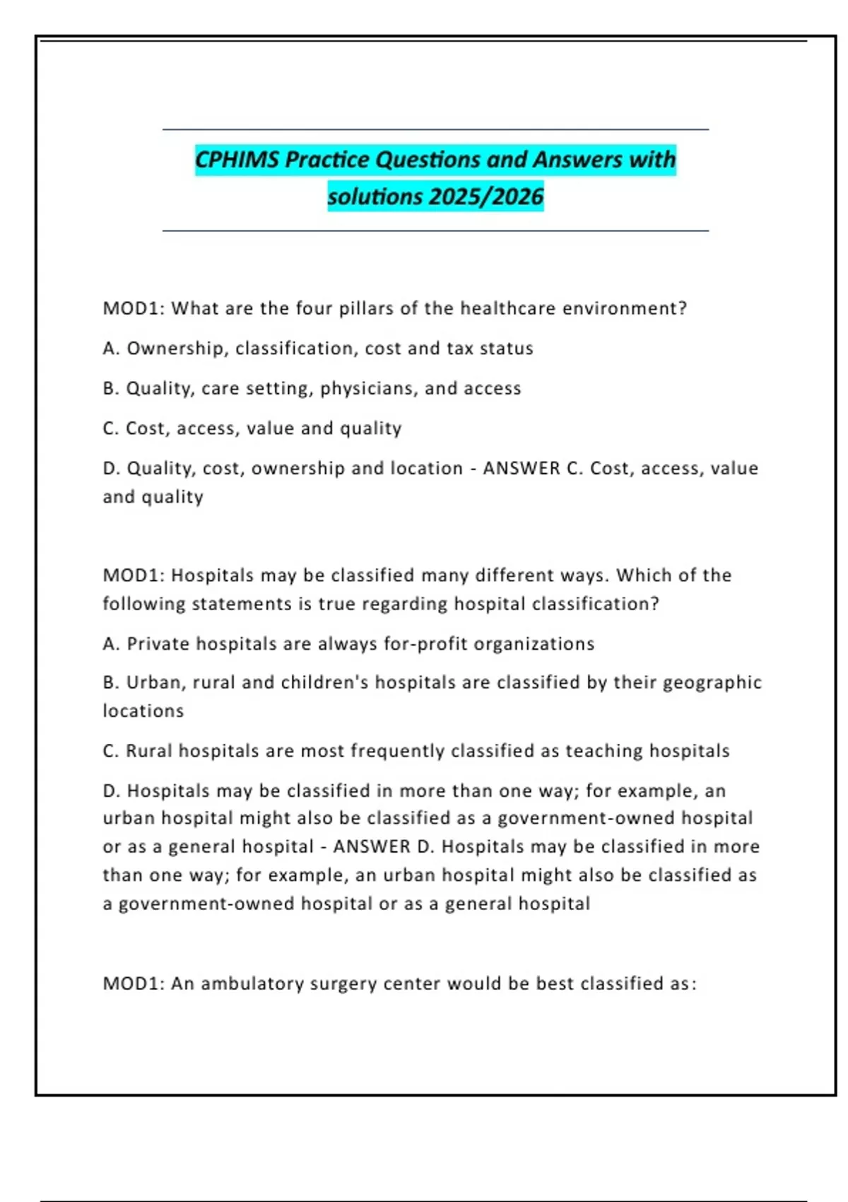 CPHIMS EXAM PACKAGE DEAL QUESTIONS AND ANSWERS WITH VERIFIED SOLUTIONS UPDATED 2025/2026