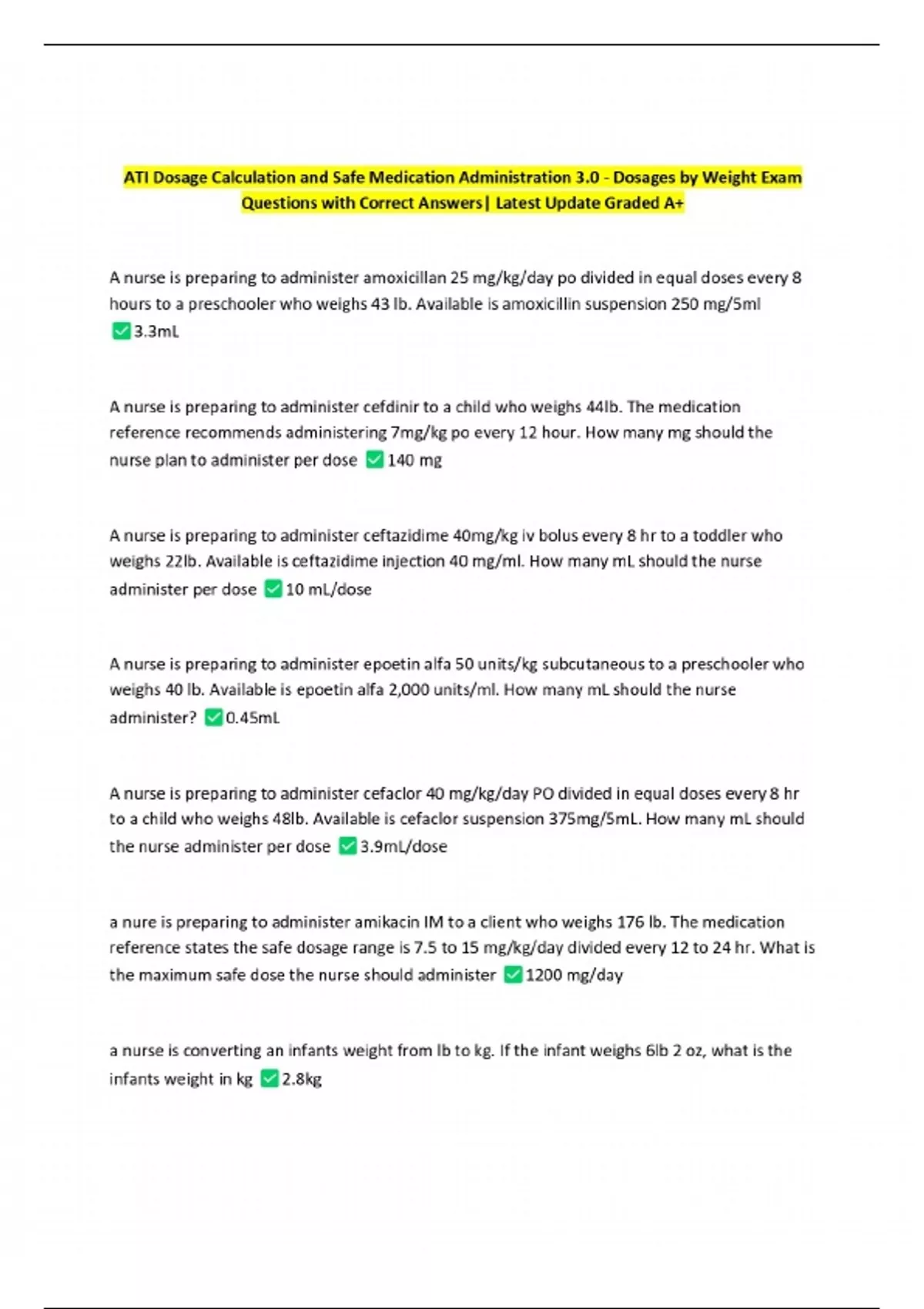 ATI Safe Dosage Calculations: Critical Care Medications Exam Questions with Correct Answers| Latest Update Graded A+ 6 Exam (elaborations) ATI Safe Dosage Exam Questions with Correct Answers| Latest Update Graded A+ 7 Exam (elaborations) ATI Dosage Calculations 3.0: Injectable Medications Exam Questions with Correct Answers| Latest Update Graded A+