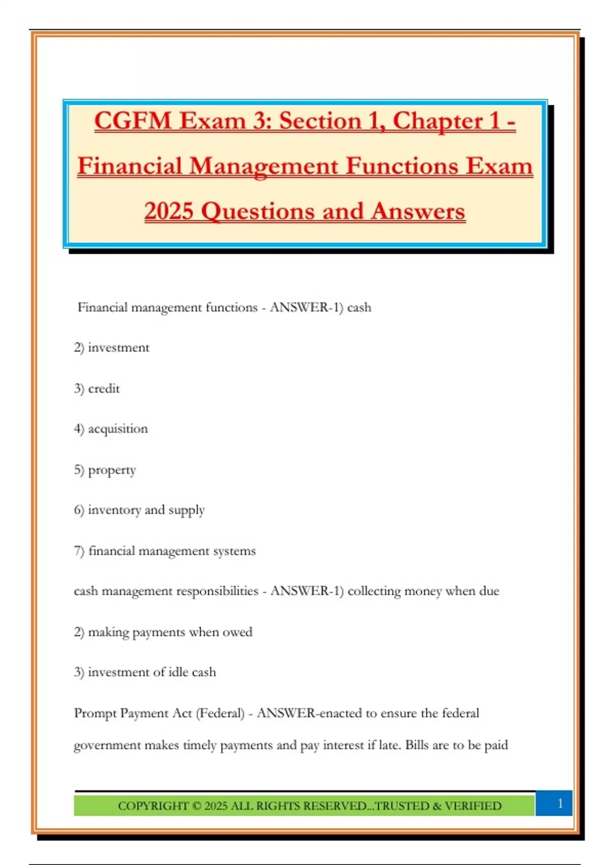 CGFM Exam 3: Section 1, Chapter 1 - Financial Management Functions Exam 2025 Questions and Answers