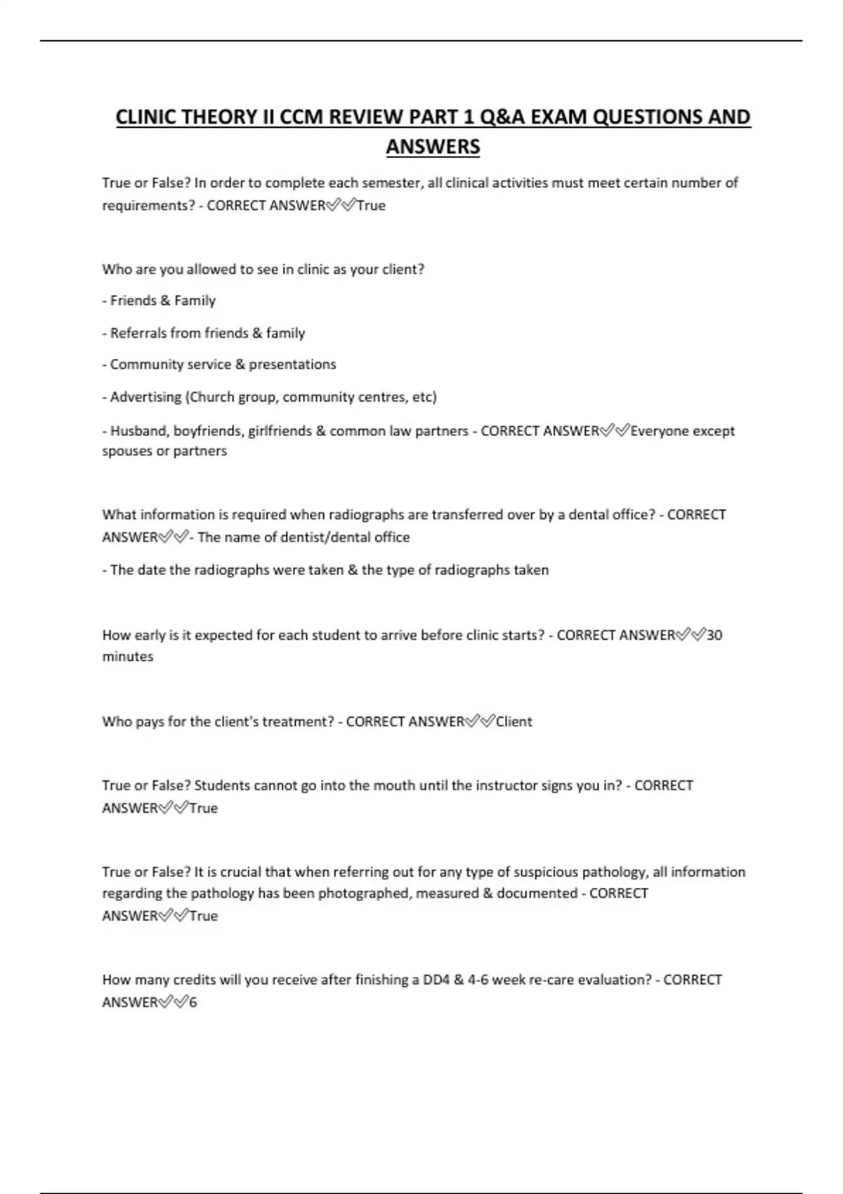 CLINIC THEORY II CCM REVIEW PART 1 Q&A EXAM QUESTIONS AND ANSWERS