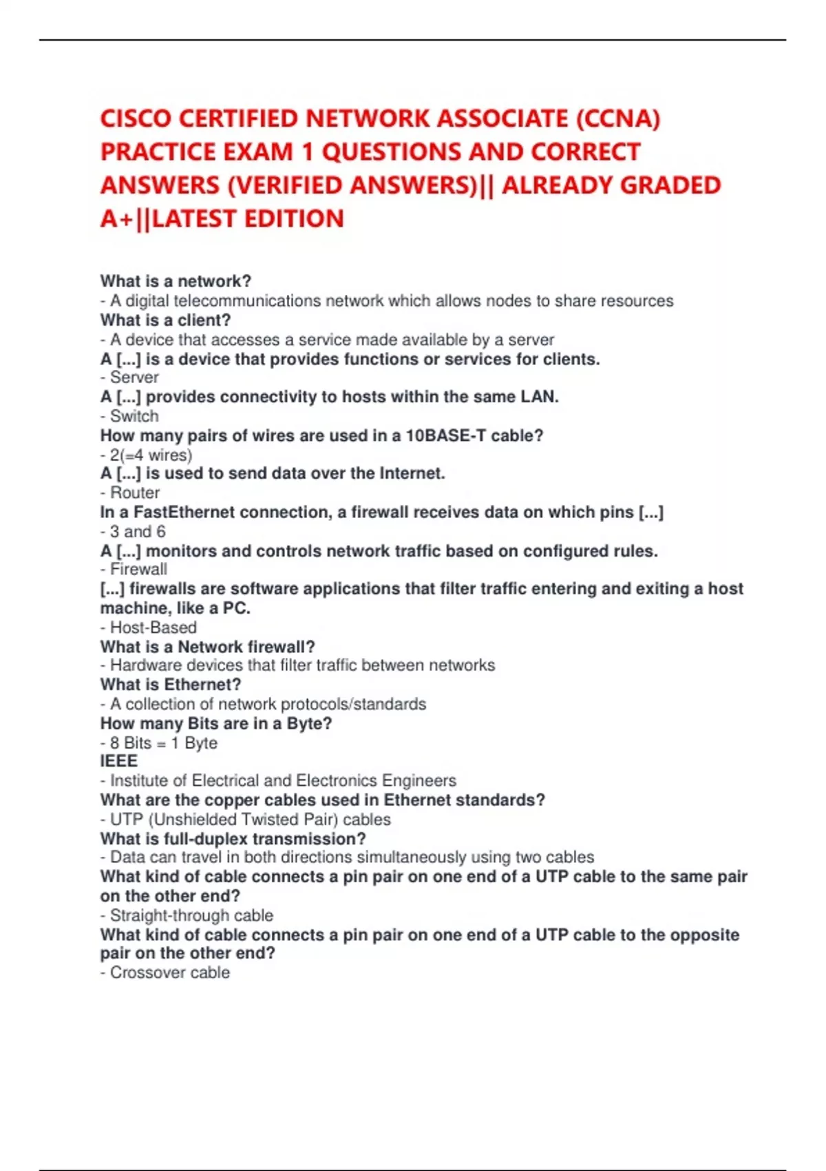 CISCO CERTIFIED NETWORK ASSOCIATE (CCNA) PRACTICE EXAM 1 QUESTIONS AND CORRECT ANSWERS (VERIFIED ANSWERS)|| ALREADY GRADED A+||LATEST EDITION CISCO CERTIFIED NETWORK ASSOCIATE (CCNA) PRACTICE EXAM 2 QUESTIONS AND CORRECT ANSWERS (VERIFIED ANSWERS) ALREADY GRADED A+||LATEST EDITION