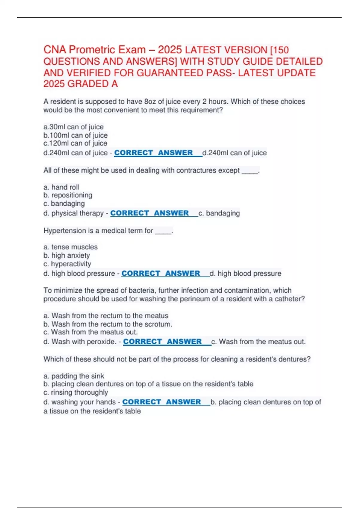 1 Exam (elaborations) CNA Practice Exam [ACTUAL EXAM] LATEST VERSION [QUESTIONS AND ANSWERS] WITH PRACTICE EXAM DETAILED AND VERIFIED FOR GUARANTEED PASS- LATEST UPDATE 2025 GRADED A 2 Exam (elaborations) CNA Chapter 4 exam, CNA Chapter 3 Exam [ACTUAL EXAM] LATEST VERSION [QUESTIONS AND ANSWERS] WITH PRACTICE EXAM DETAILED AND VERIFIED FOR GUARANT
