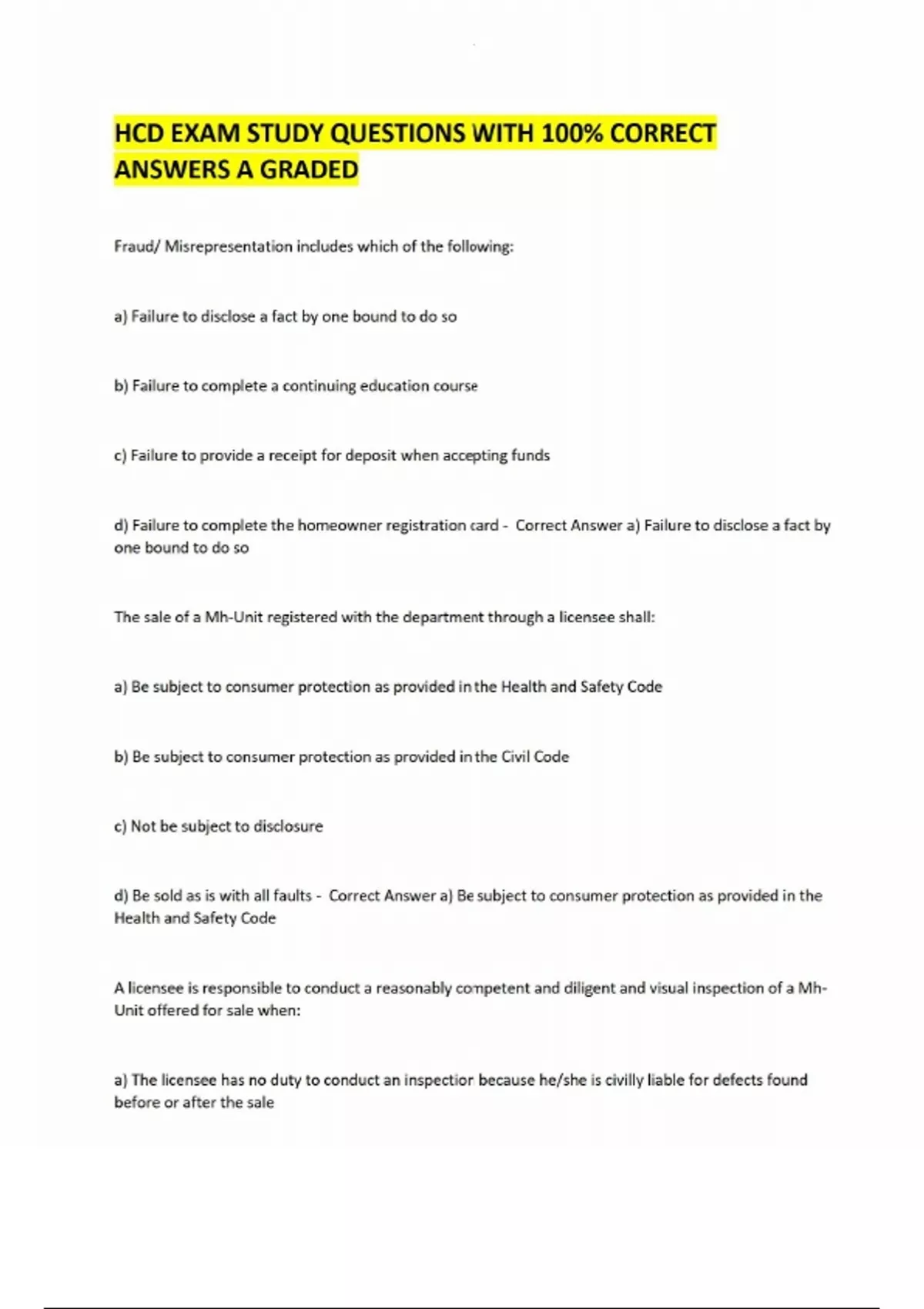 HCD EXAM STUDY QUESTIONS WITH 100% CORRECT ANSWERS A GRADED/CALIFORNIA REAL ESTATE EXAM MULTIPLE CHOICE EXAM 500 QUESTIONS AND CORRECT DETAILED ANSWERS WITH RATIONALES|/