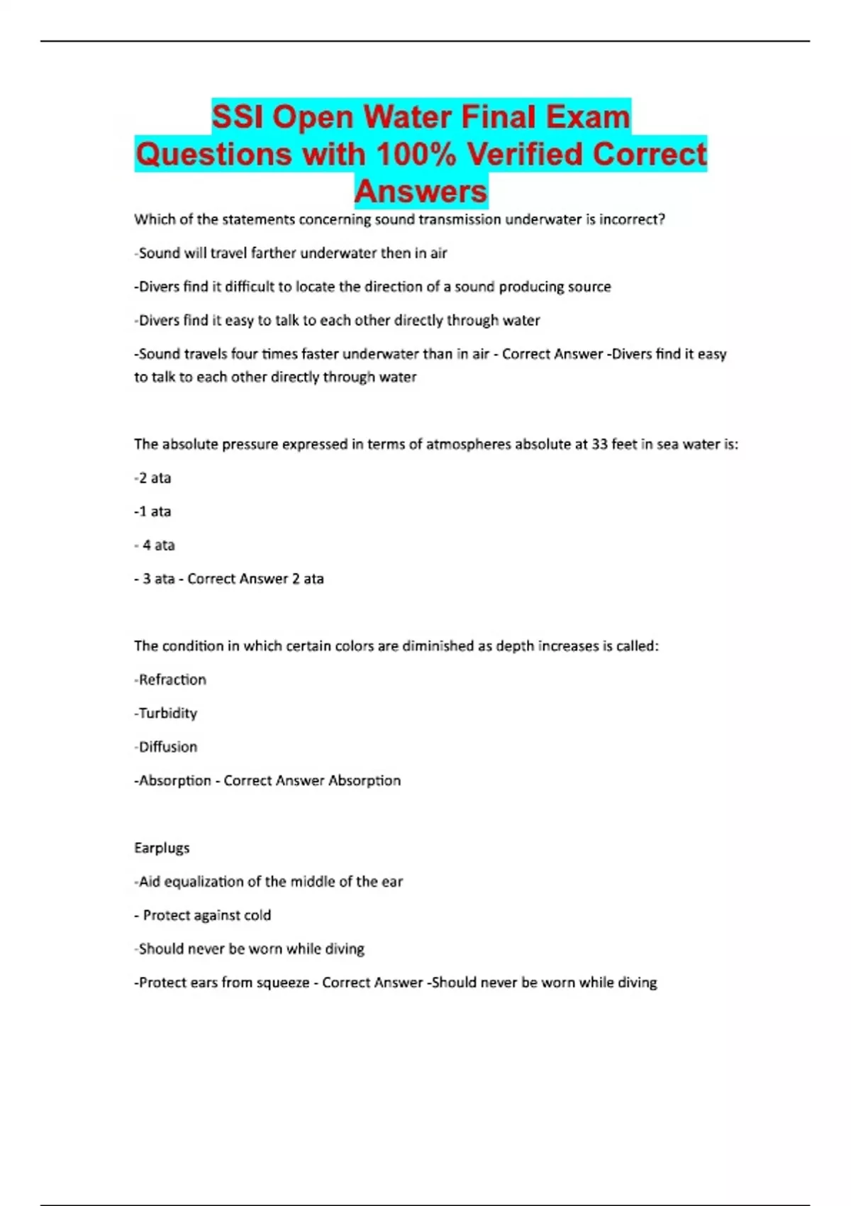 SCUBA, SSI Open Water Diver Final Exam Questions with 100% Verified Correct Answers