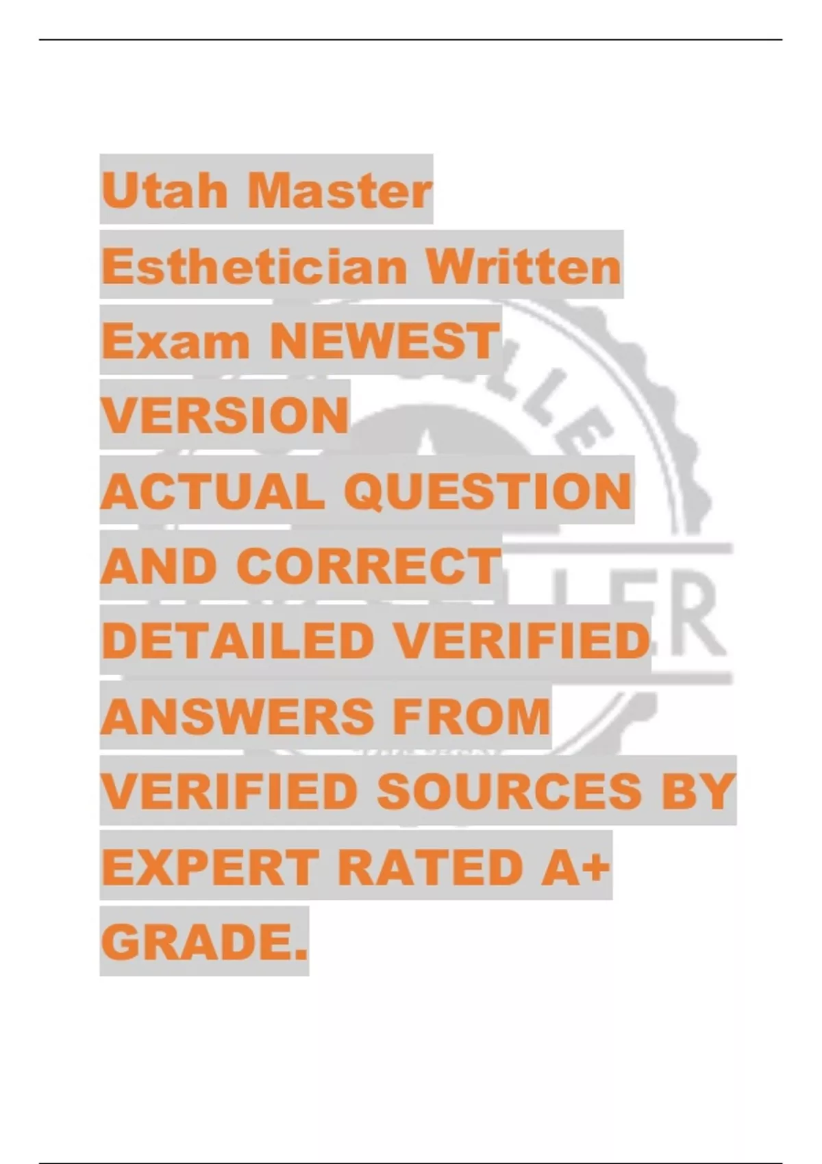 This Utah Master Esthetician Written Exam package deal combines multiple versions of the exam into one complete study resource. It includes real exam-style questions and verified correct answers, giving you full coverage of the material tested. Designed to guarantee success, this set provides accuracy, reliability, and convenience for anyone prepar