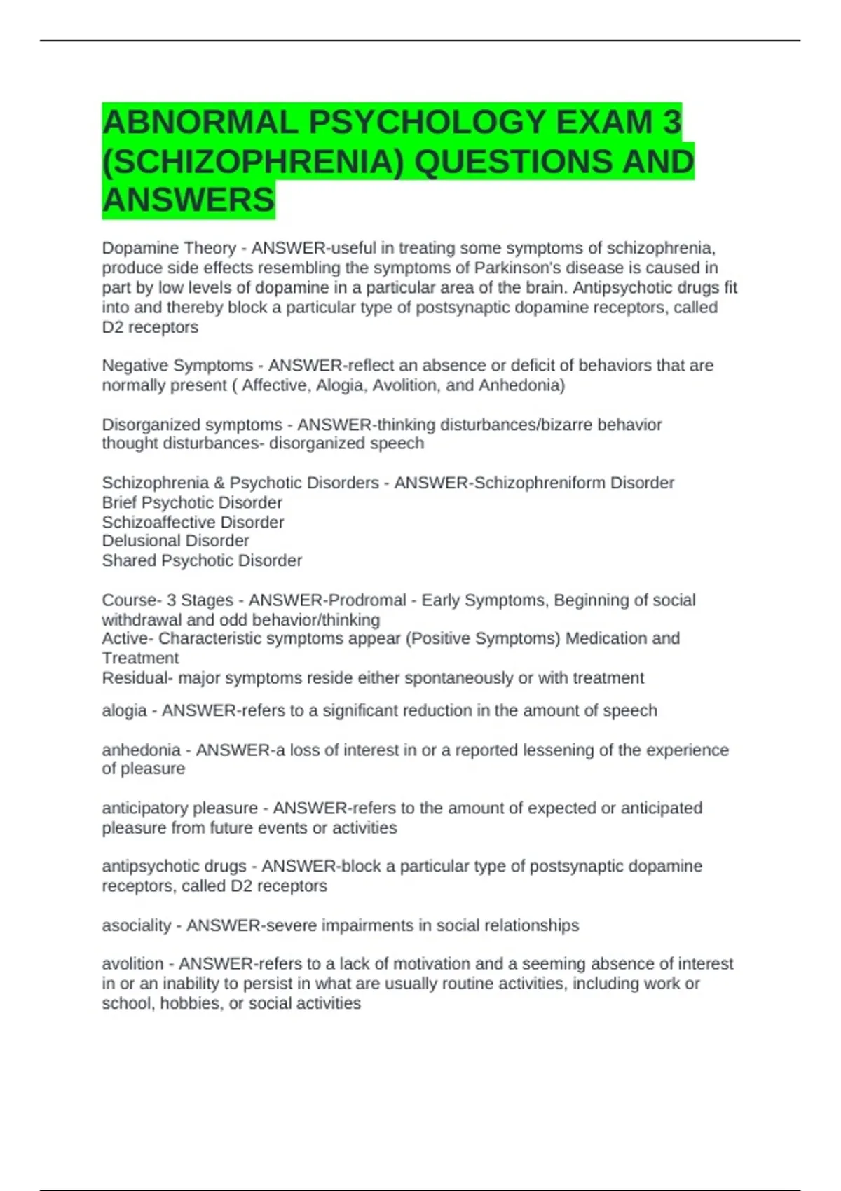 SCHIZOPHRENIA - FINAL EXAM QUESTIONS AND ANSWERS