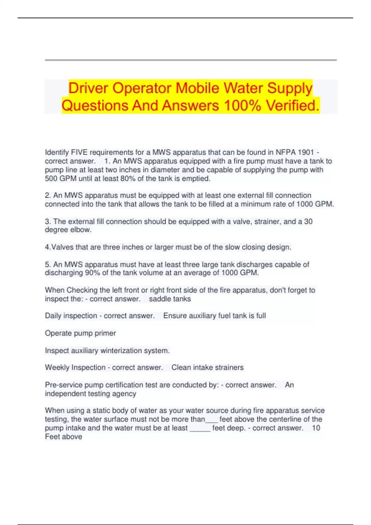 DRIVER OPERATOR CHAPTER 16 - INTRODUCTION TO AERIAL FIRE APPARATUS - EXAM PREP QUESTIONS AND ANSWERS GRADED A+ LATEST UPDATE. DRIVER OPERATOR MOBILE WATER SUPPLY EXAM QUESTIONS AND ANSWERS GRADED A+ 100% VERIFIED.