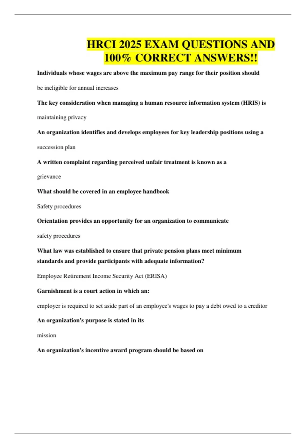 HRCI EXAMS BUNDLE, ALL WITH QUESTIONS AND 100% CORRECT ANSWERS