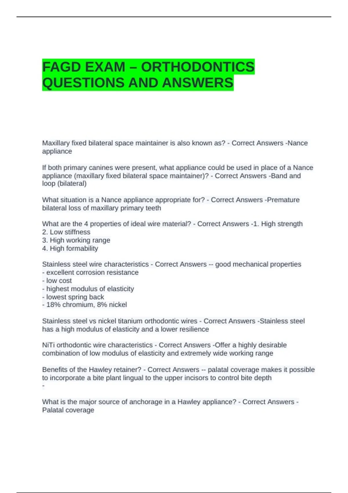 1 Exam (elaborations) FAGD ORAL SURGERY (15 QUESTIONS WITH CORRECT ANSWERS) 2 Exam (elaborations) FAGD EXAM QUESTIONS WITH VERIFIED ANSWERS | GRADED A 3 Exam (elaborations) FAGD EXAM QUESTIONS WITH VERIFIED ANSWERS 4 Exam (elaborations) FAGD EXAM QUESTIONS WITH CORRECT ANSWERS (GRADED A) 5 Exam (elaborations) FAGD EXAM – ORTHODONTICS QUESTIONS