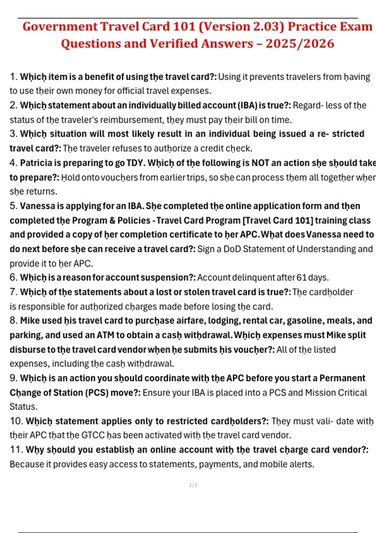 Government Travel Card Training Exam – Certified Questions and Answers (100% Guaranteed Pass, 2025/2026) Government Travel Card Training Program (Travel Card 101) [Mandatory] – Test Questions and Revised Answers (Latest 2025/2026) Travel Card 101 (Version 3.02) – GTC Training Exam with Study Questions and Verified Answers (2025/2026) Government Tra